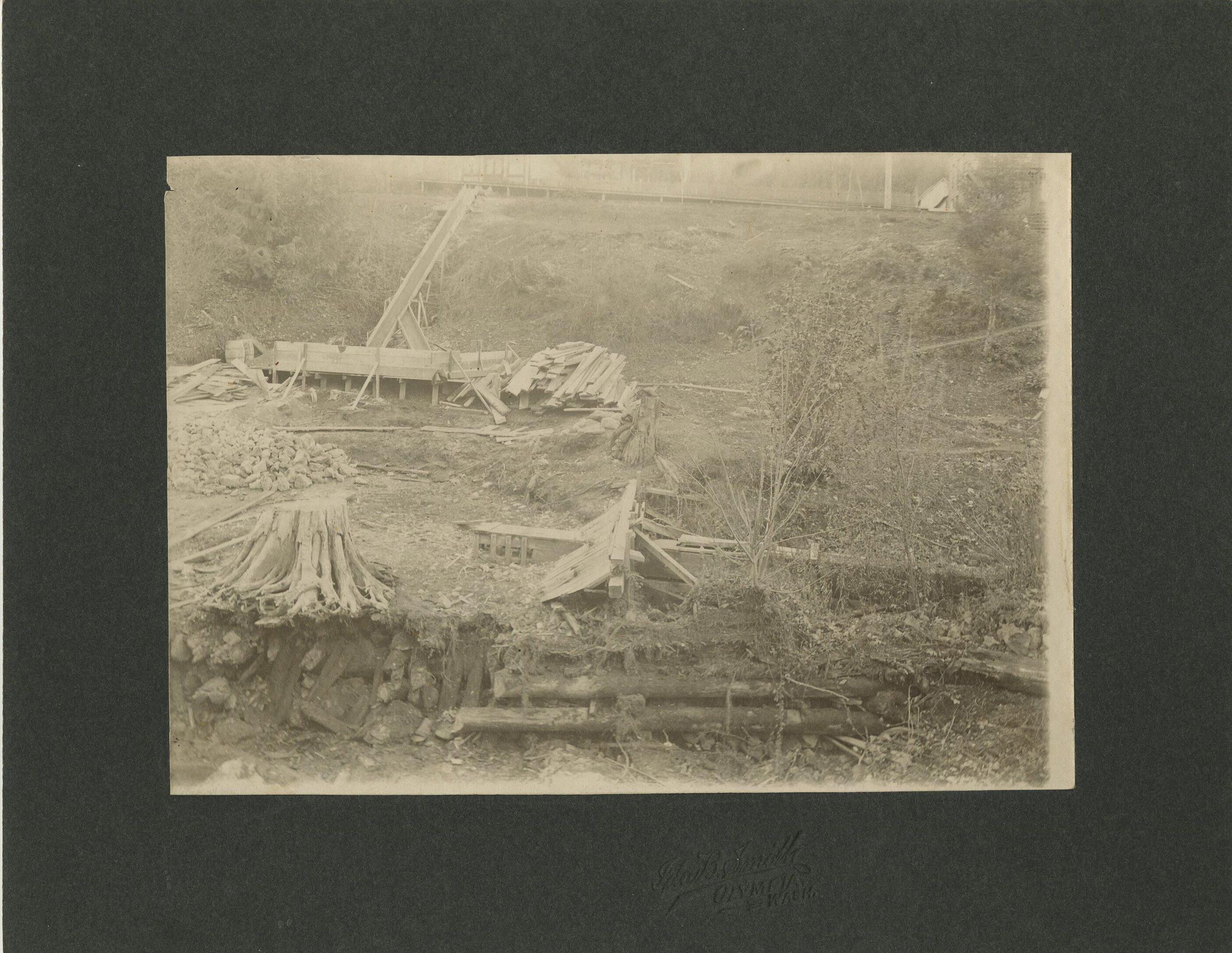 Print, photographic. 5 x 7 b&w, matted on 7 1/4 x 9 1/4 cardboard. Shows gas producer site, old log cribbing, and new lumber flume. Back reads: "Photo taken Nov. 4 1905 by Frank M. Kenney." Reproduced or mounted by Ida B. Smith, Photographer.Name/Title