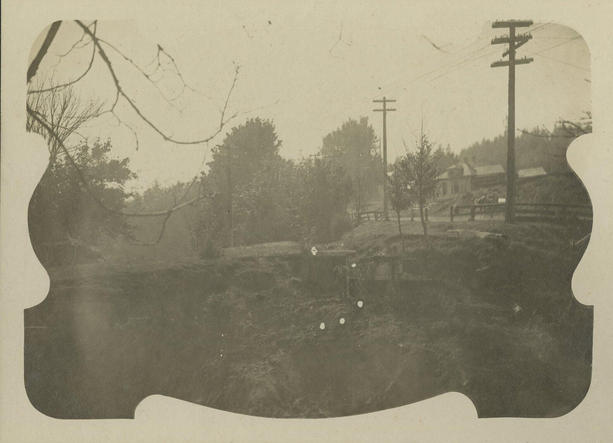 Print, photographic (2). 5 x 7 b&w, matted on 8 x 10 cardboard. Shows gas producer site, house and power/telephone poles in background. Written on back: "Sept 19th 06"
