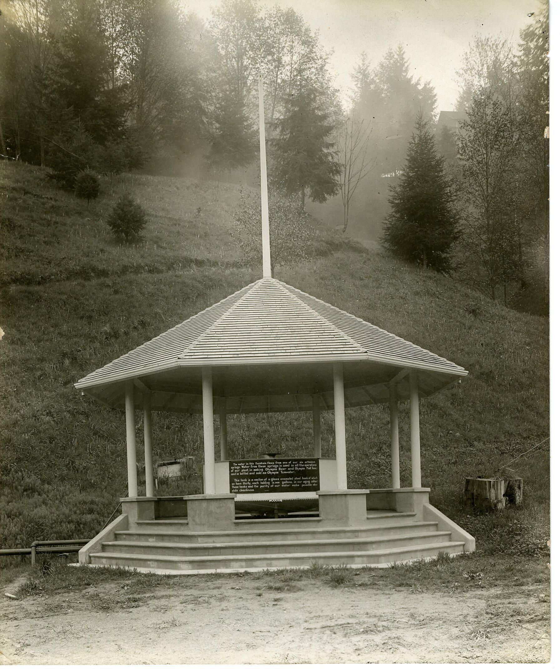 Print, photographic. 5 3/4 x 7 b&2. Shows gazebo structure over artesian well, built on original Olympia Brewing Company property. Sign on fountain reads: "The water in this Fountain flows from one of our six artesian springs. Water from these springs is used in all the operations of our plant, in making Olympia Beer and Olympia Malt Tonic, and is bottled and sold as Olympia Tumwater. This tank is a section of a glass enameled steel tank of which we have thirty, each holding 12,000 gallons, in our aging cellar. These tanks and the purity of our water make possible absolute cleanliness."Name/Title