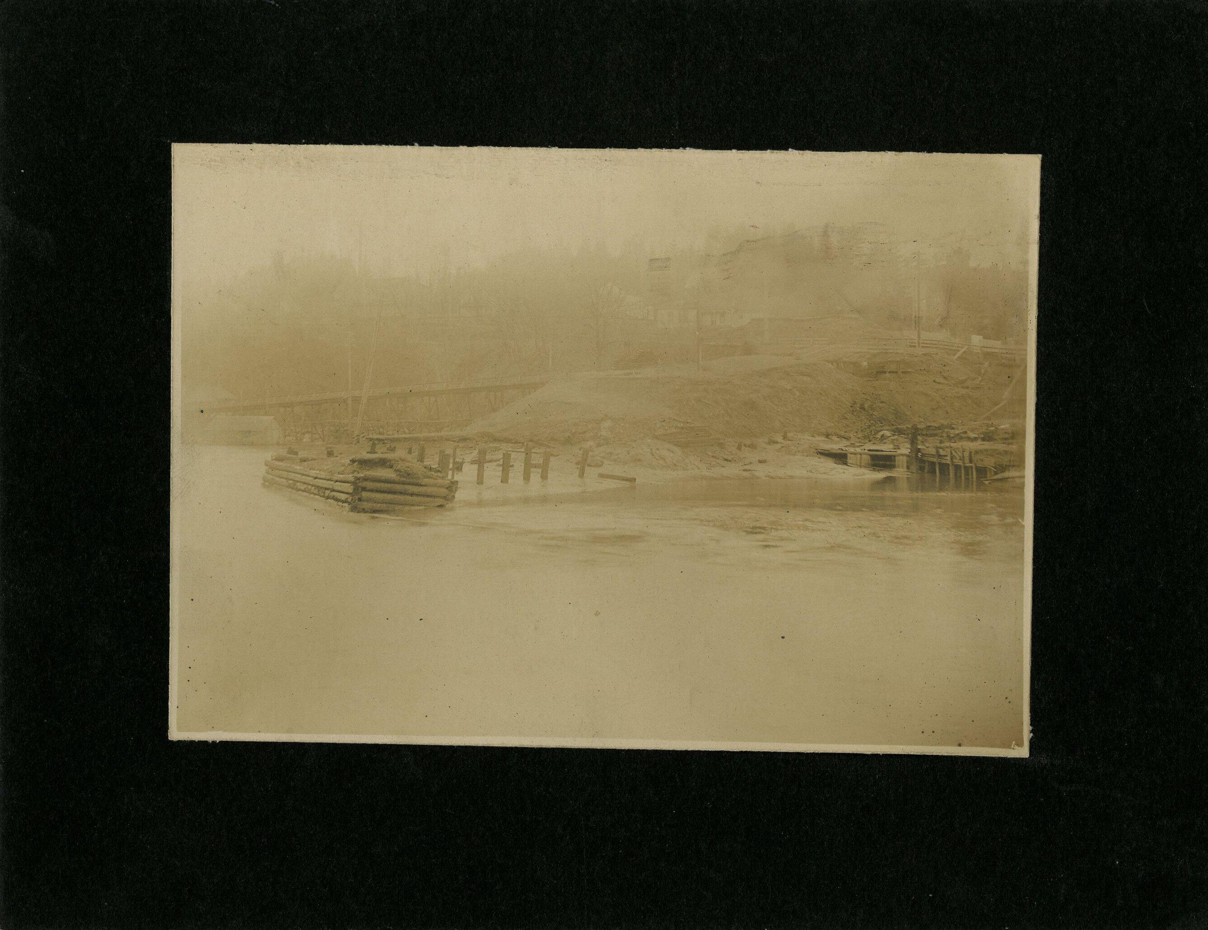 Print, photographic. 4 1/2 x 6 1/4 sepia, matted on 7 x 9 cardboard. Shows gas producer site along Deschutes River.
