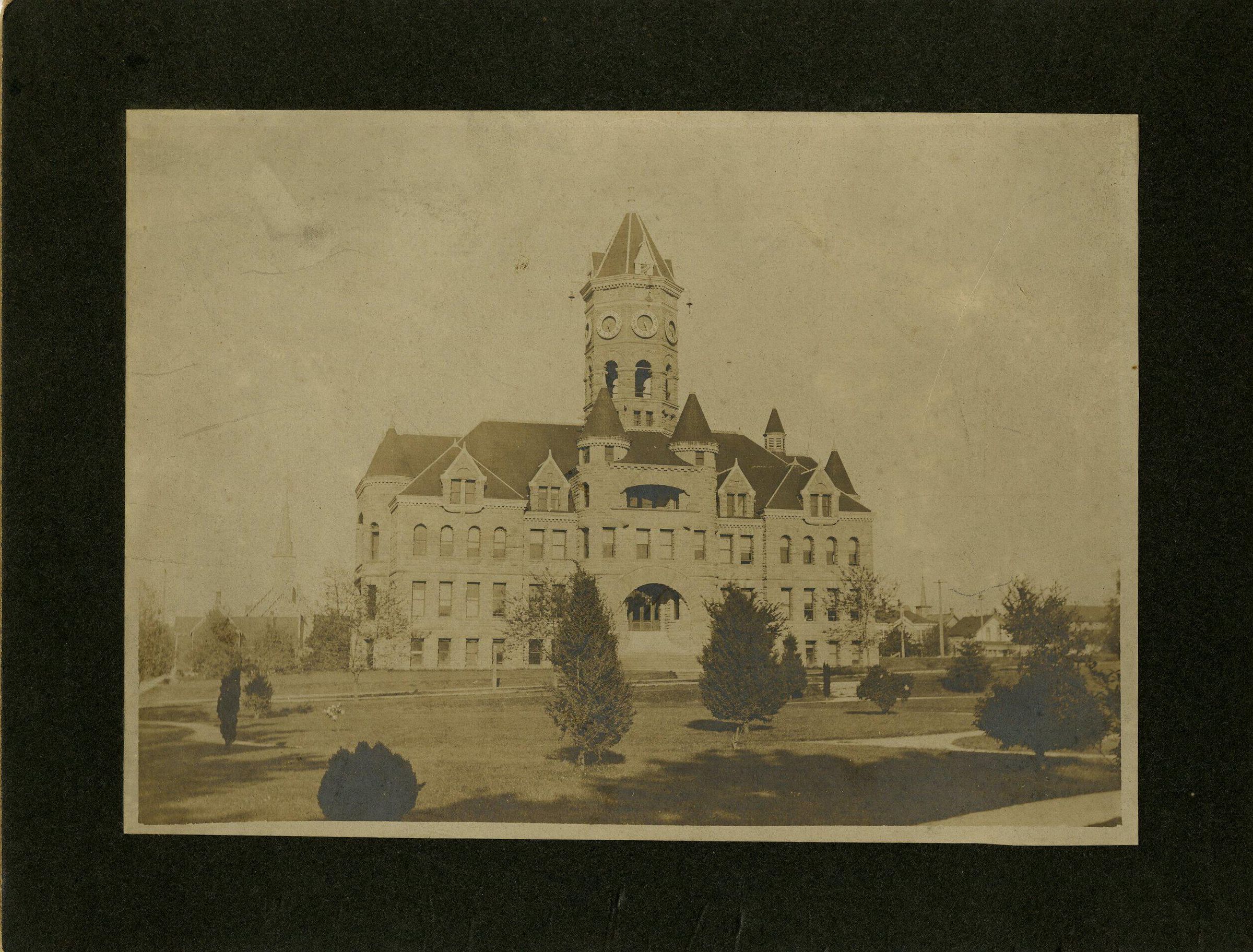 Print, photographic. 5 x 6 3/4 sepia, mounted on 6 1/2 x 8 1/2 cardboard. Shows Thurston County Courthouse, with Sylvester Park in foreground.