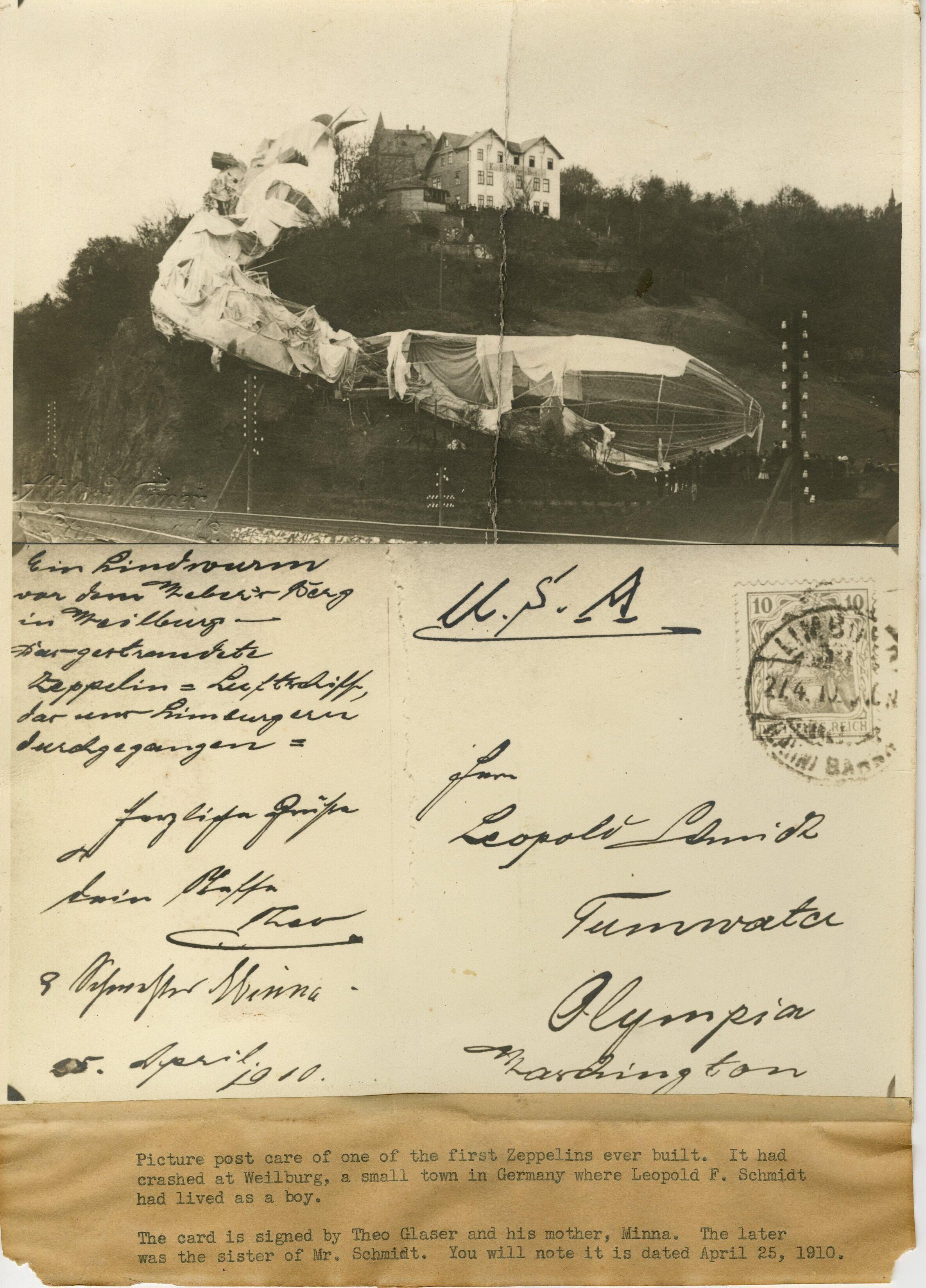 Print, photographic. 8 x 10 b&w, with glued-on paper strip at bottom. Print of front and back of postcard, showing crash of one of first Zeppelins. Card was sent by Theo Glaser and his mother Minna (sister of Leopold Schmidt) to Leopold Schmidt.Name/Title