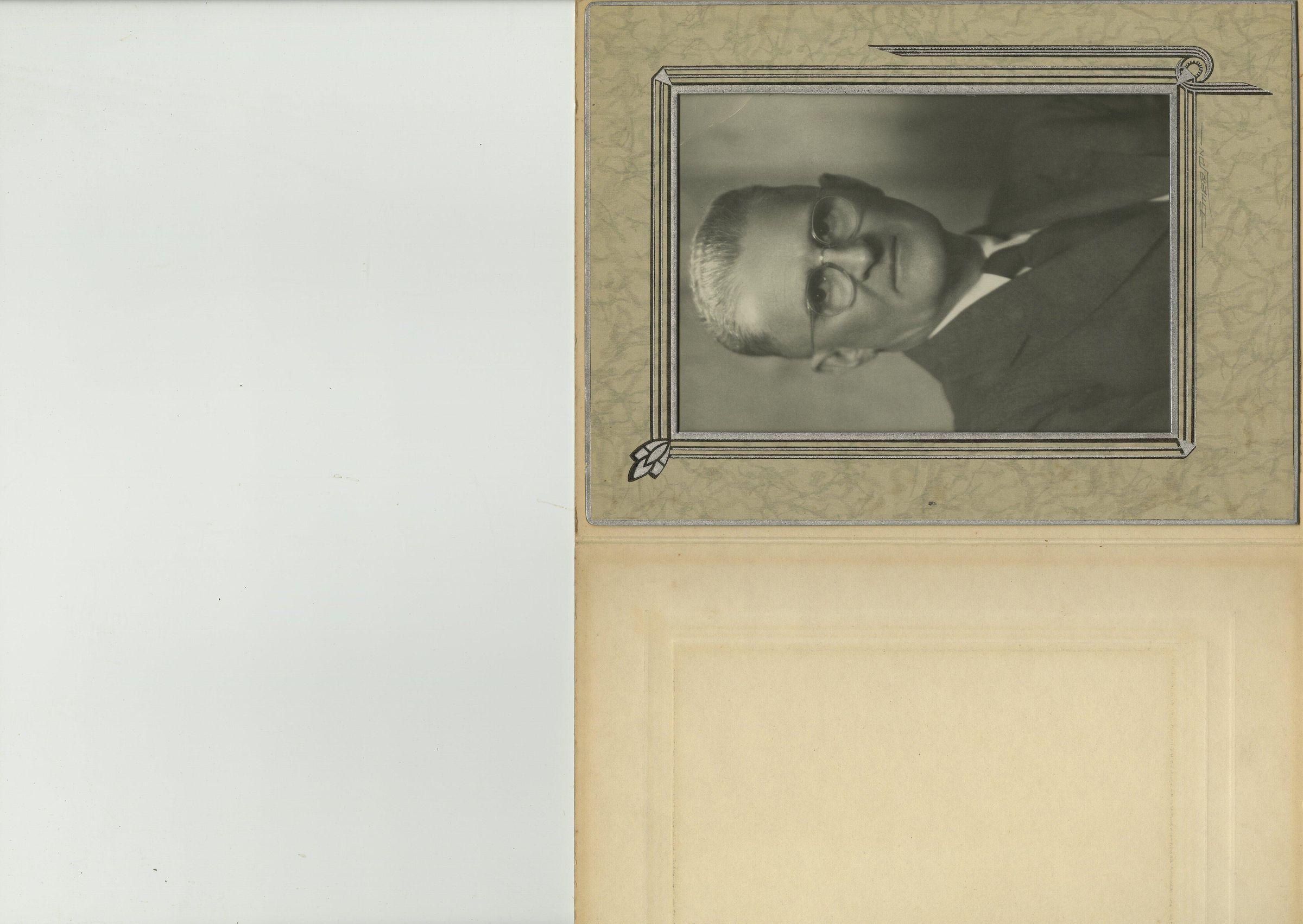 Print, photographic. 4 1/2 x 6 1/2 b&w, mounted in Emerson Studio folder. Portrait of Peter G. Schmidt, Sr., unknown date. Same photo as 103.1.86.