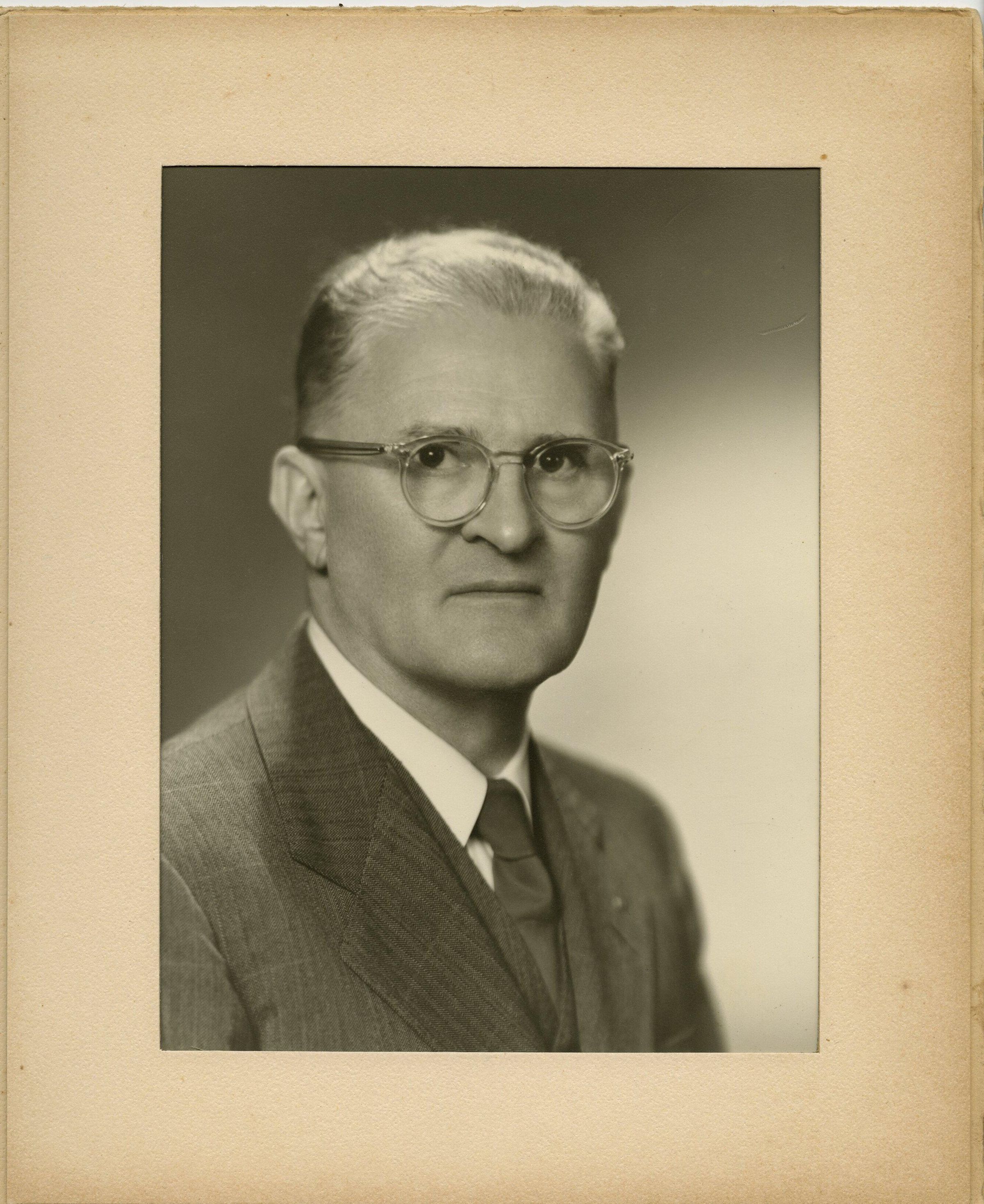 Print, photographic. 8 x 10 b&w, mounted in Vibert Jeffers folder. Portrait of Peter G. Schmidt, Sr., unknown date. Same photo as 103.1.116.