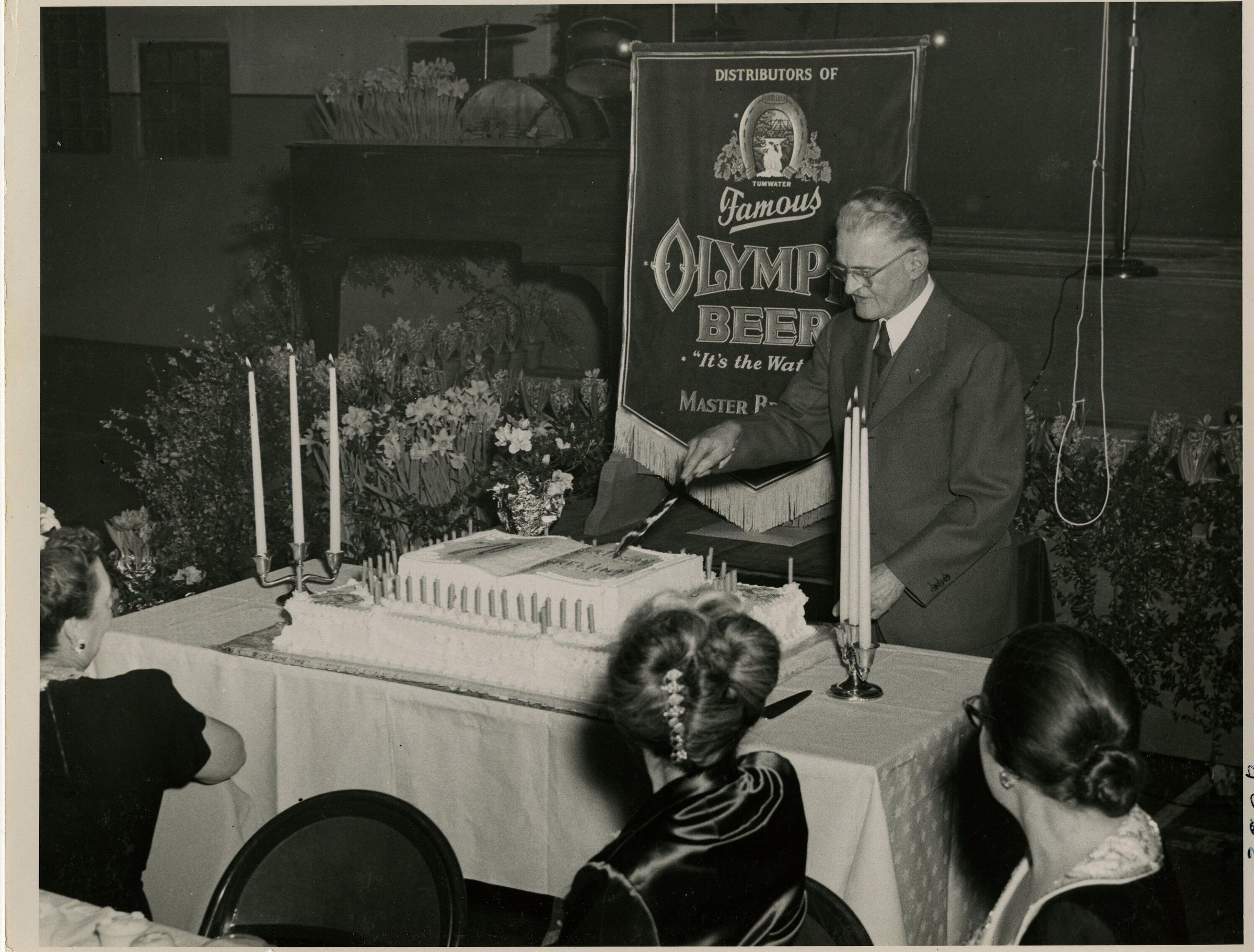 Print, photographic. 8 x 10 b&w. Taken February 1950 at Peter G. Schmidt Sr.'s 70th birthday celebration organized by Olympia Brewing Company. Shows Peter beginning to cut the birthday cake. Clara in center foreground. Philippine Schmidt at right. Same photo as 103.1.75.Name/Title