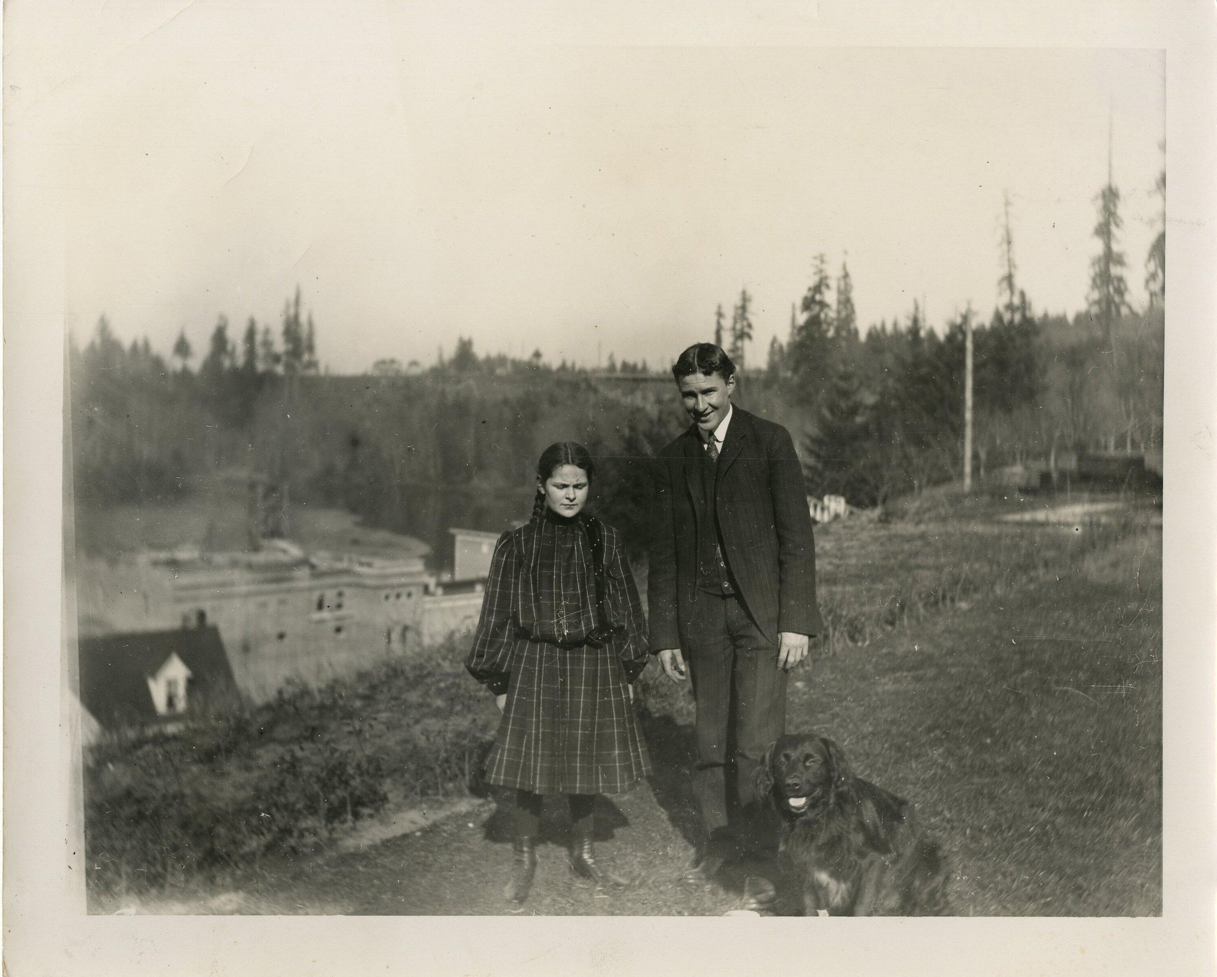 Print, photographic. 8 x 10 b&w. Philippine Schmidt and Adolph Schmidt (Sr.) with dog, on hill above old brewery (which shows in background).