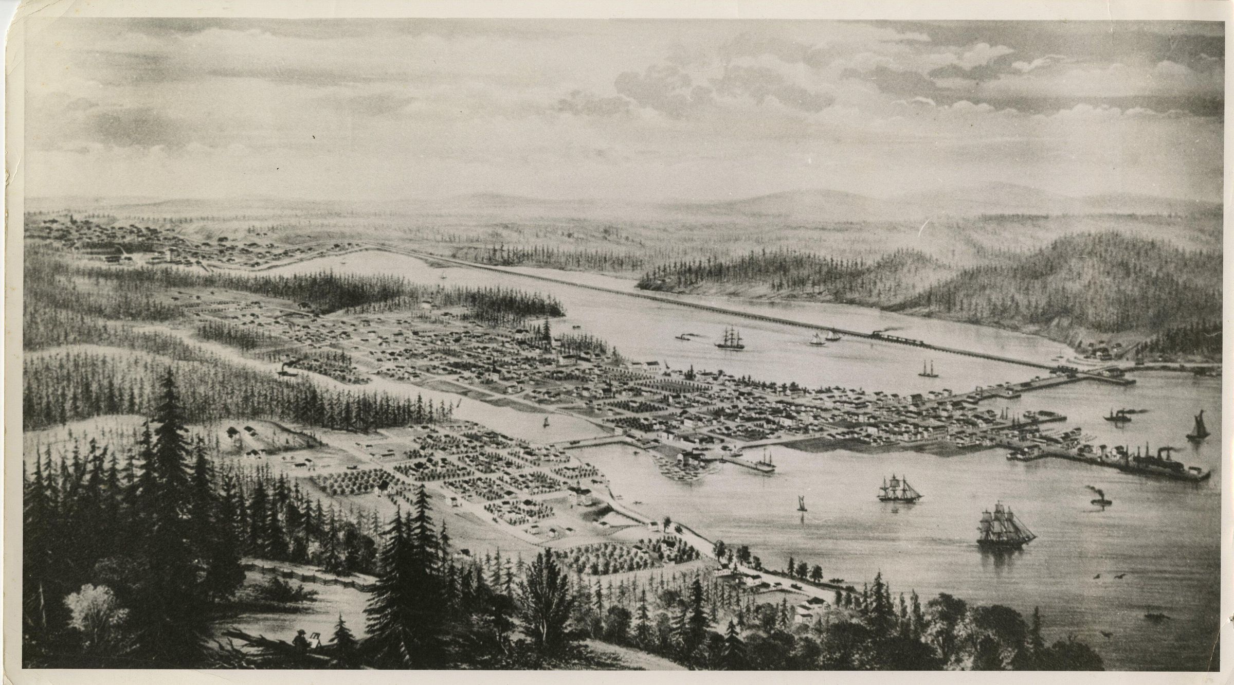 Print, photographic. 8 x 14 b&w. Photo of 1879 birds-eye view of Olympia, WA. Drawing made from east hill above Olympia, looking west. Shows city, harbor, with Deschutes River falls at far left background. Artist E. S. Glover.Name/Title