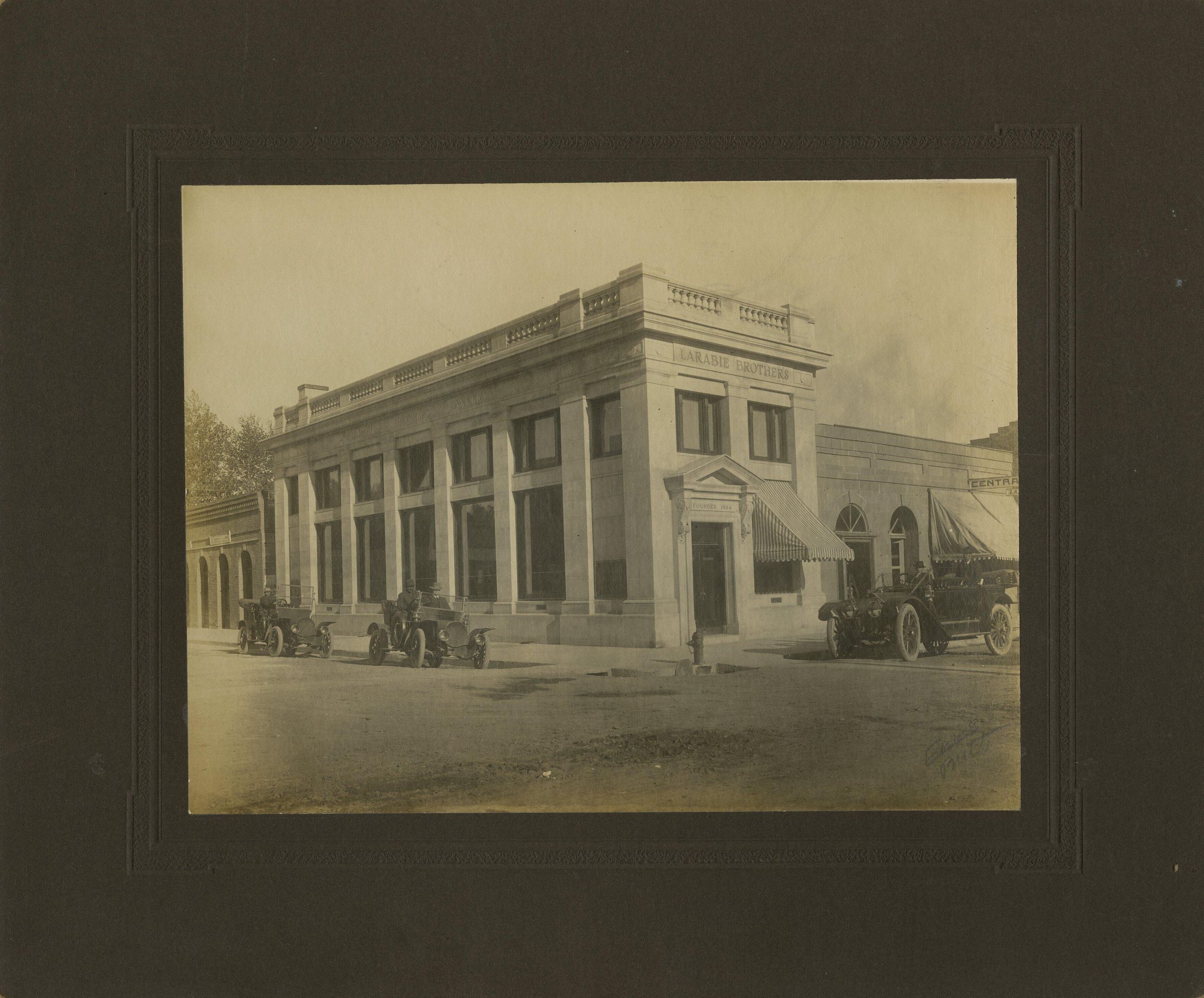 Print, photographic. 6 x 8 b&w, mounted on cardboard. Shows Larabie Brothers Bank in Butte, Montana. Three cars on street.