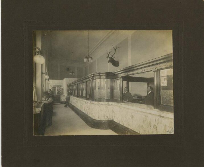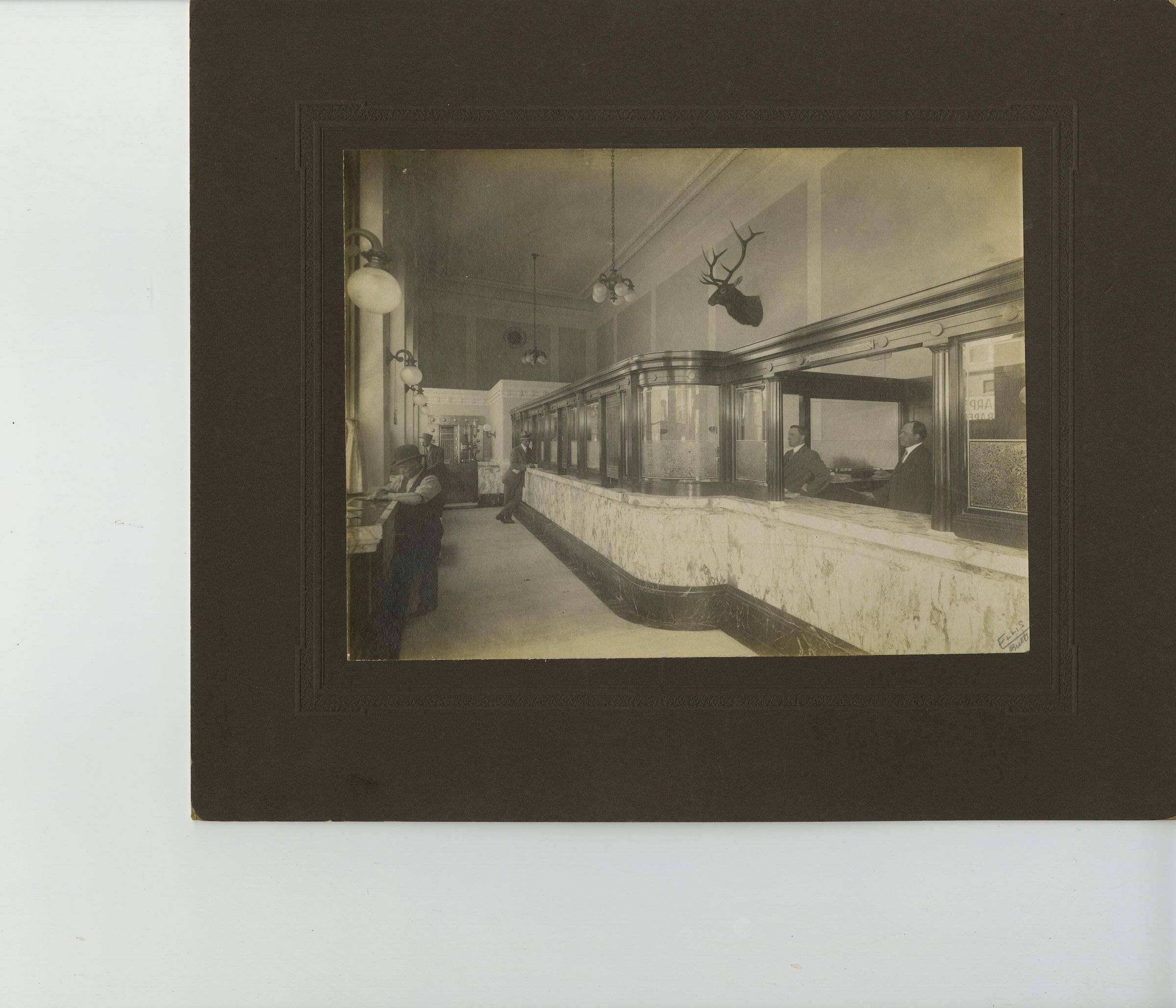 Print, photographic. 6 x 8 b&w, mounted on cardboard. Shows interior of Larabie Brothers Bank in Butte, Montana.