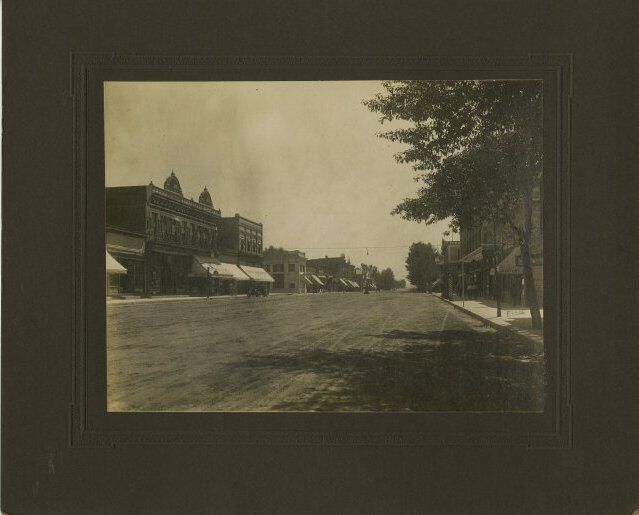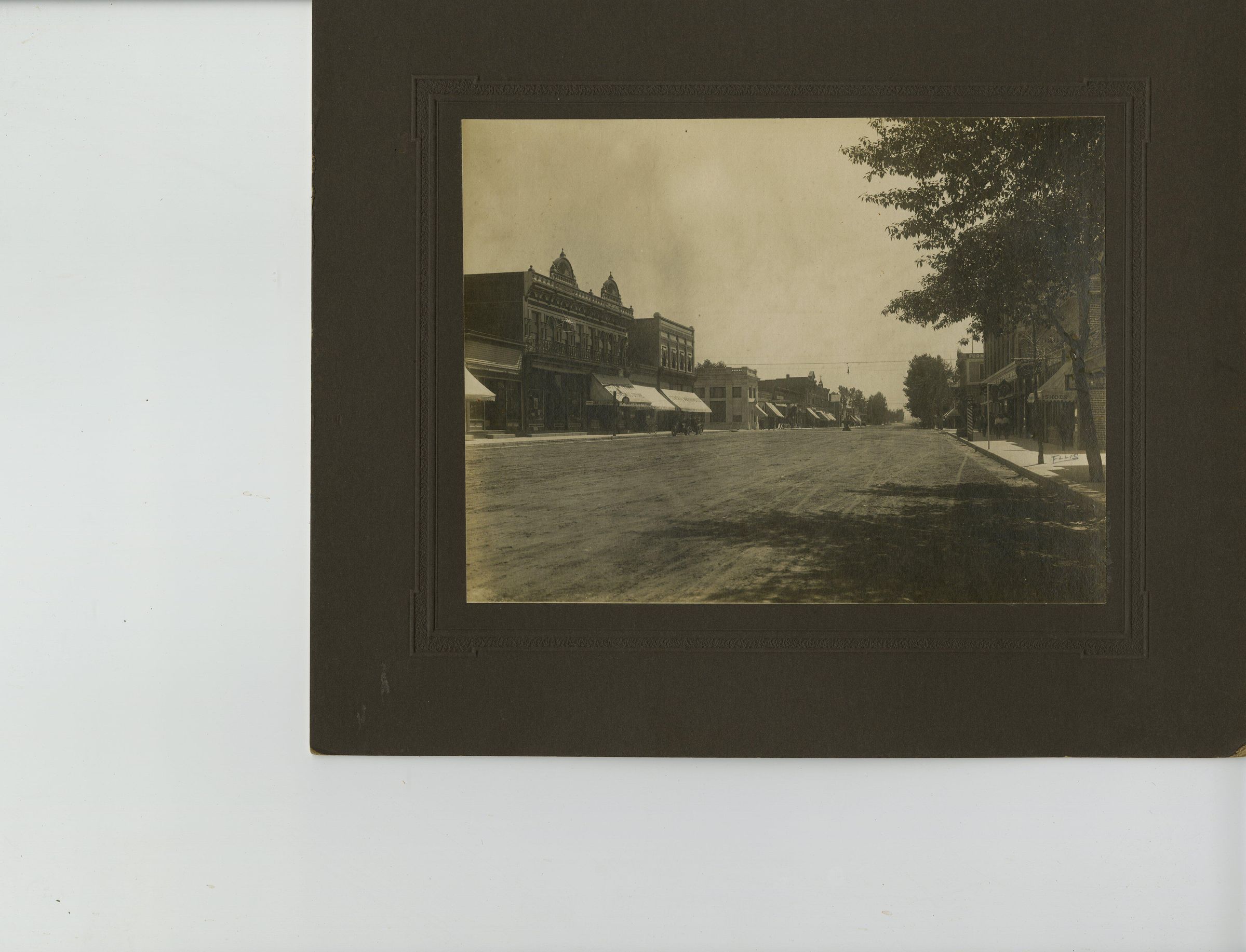 Print, photographic. 6 x 8 b&w, mounted on cardboard. Shows main street of Butte, MT. Unknown date, but has early car along street.
