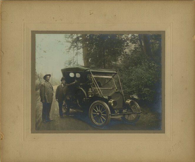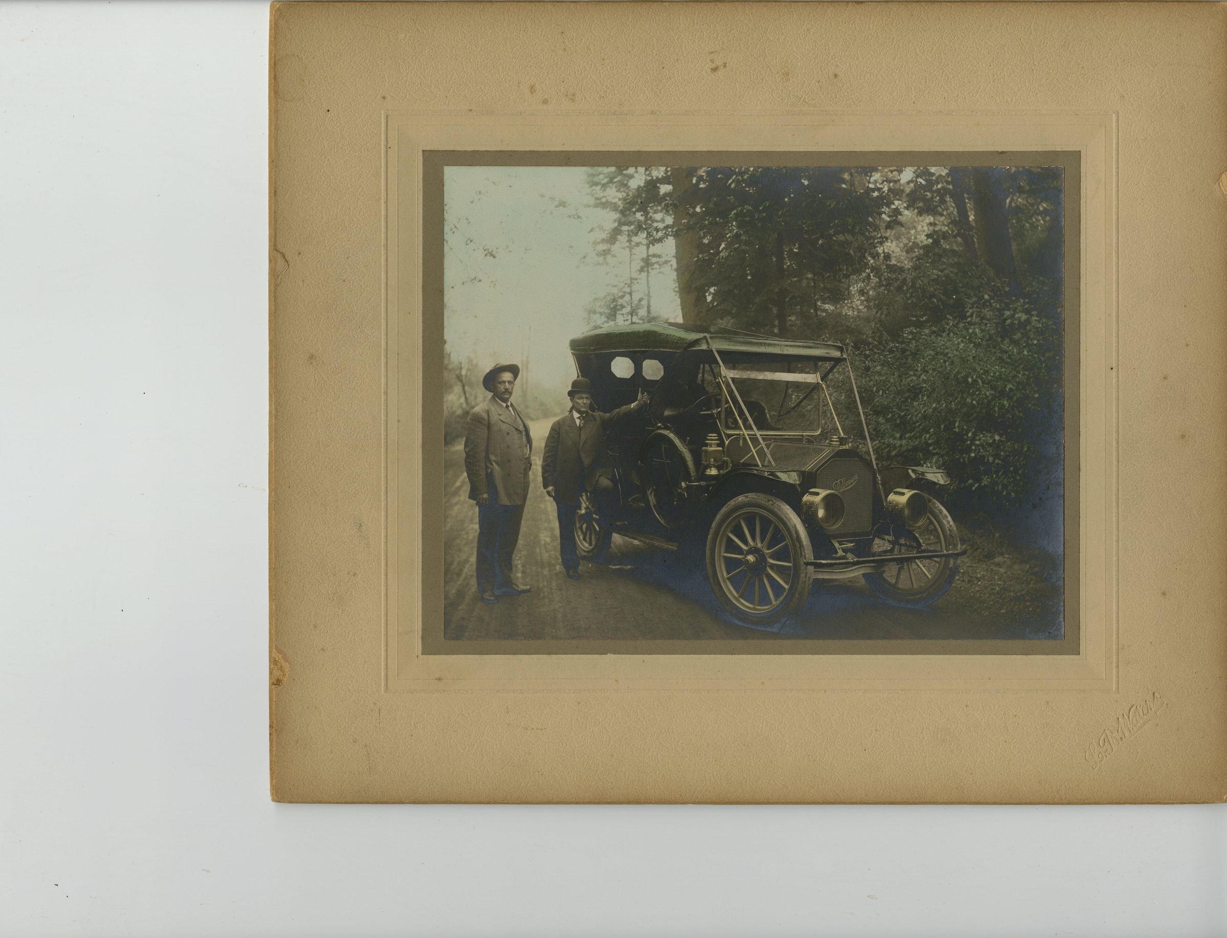 Print, photographic. 6 x 8 hand-tinted, mounted on cardboard. Shows early auto with G. S. Robison and unidentified man (unsure which is which) standing by car, and Leopold F. Schmidt in car, on their way to or from Alaska-Yukon-Pacific Exposition in Seattle.Name/Title