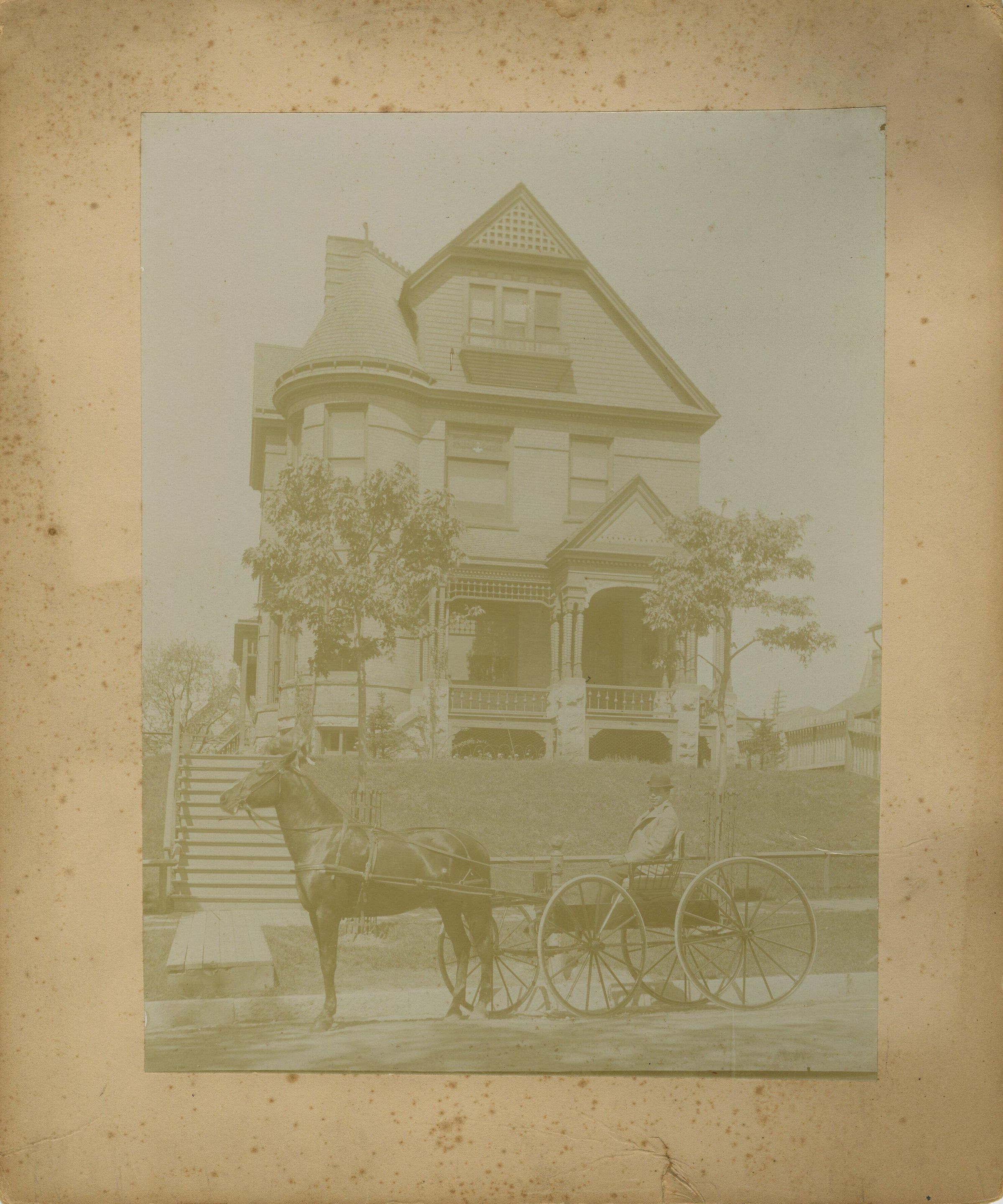 Print, photographic. 7 1/4 x 9 1/2 sepia, mounted on cardboard. Shows horse, carriage, and driver on street in front of 4-story Victorian house. Unknown date, unknown location. Might be Anaconda, MT. Might be Portland, OR as something that looks like a ship's mast appears in the far right background. Back of photo reads in pencil: "To Peter, Comp of Phil & Adolph."Name/Title