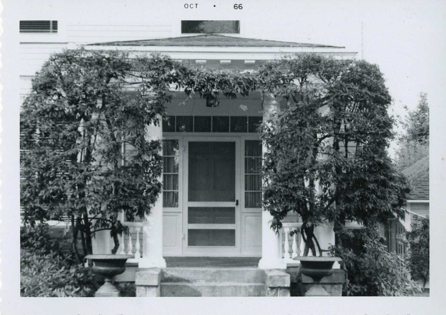 Print, photographic. 3 1/2 x 5 b&w. Snapshot of front door of Schmidt House, Three Meter, in Tumwater WA.