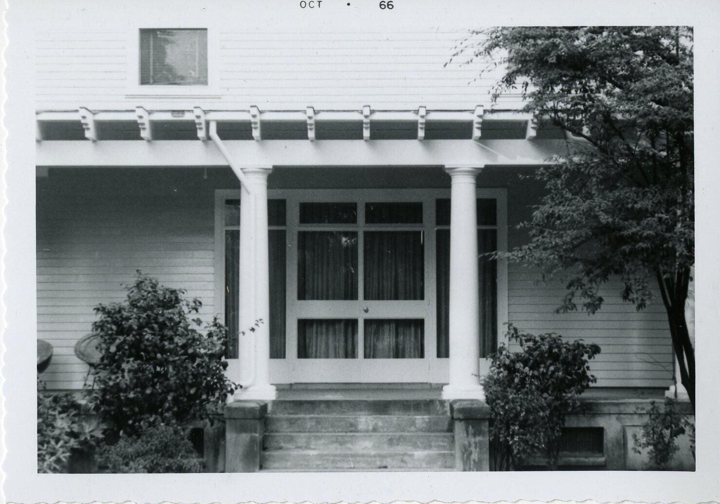 Print, photographic. 3 1/2 x 5 b&w. Snapshot of double door in living room of Schmidt House, Three Meter, in Tumwater WA.