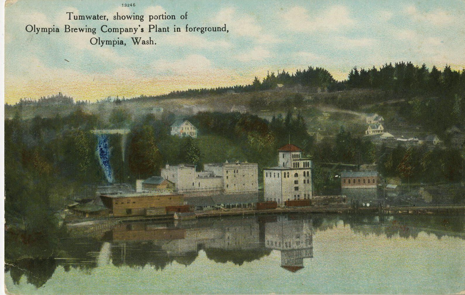 Postcard, picture. 3 1/2 x 5 1/4 color. "Tumwater, showing portion of Olympia Brewing Company's Plant in foreground, Olympia, Wash." Probably from 1907 or later, as Three Meter does not yet have addition, and back of postcard is divided (post-1906).Name/Title