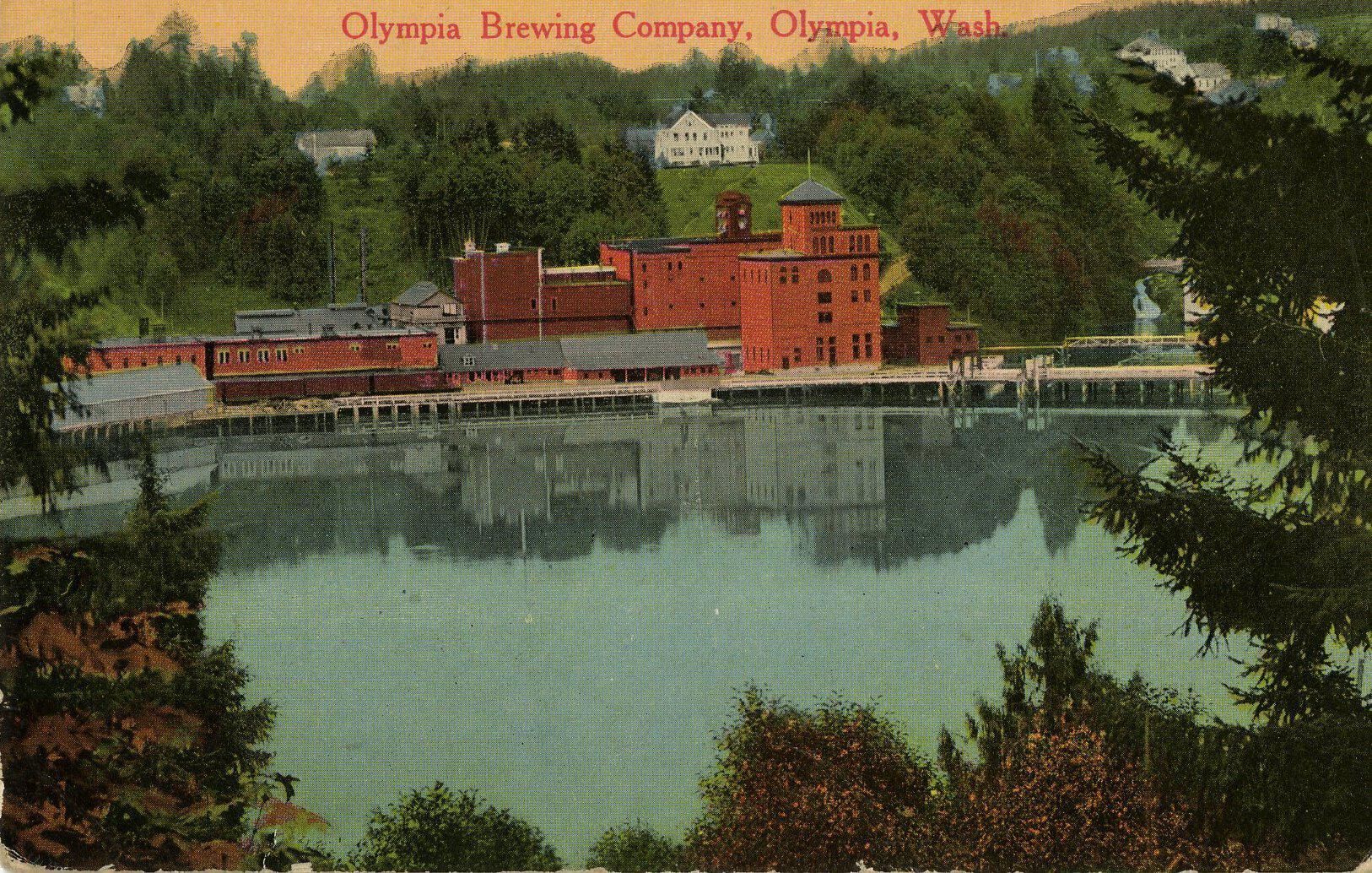 Postcard, picture. 5 1/2 x 3 1/2 color. View of Olympia Brewery (old) looking southwest, with Schmidt House on hill in background. Penciled note on back: "From Reid Kinsey"