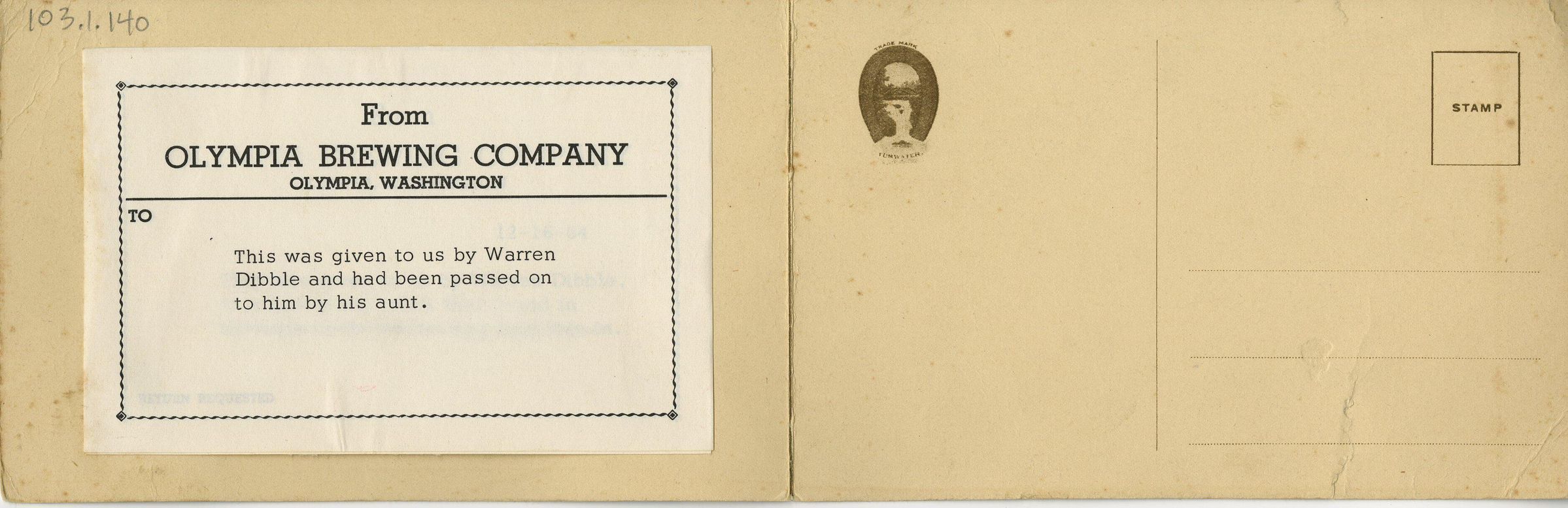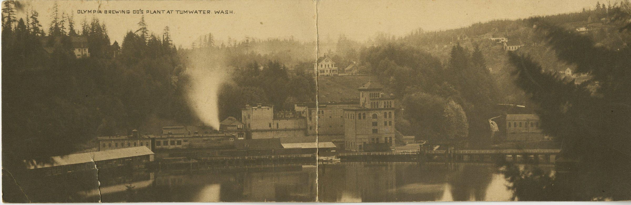 Postcard, picture. 4 x 12 1/2 sepia. Double-wide postcard with photo of old Olympia Brewery looking southwest, with Schmidt House in background. "Olympia Brewing Co's Plant at Tumwater Wash." Back of card has OBC label: "This was given to us by Warren Dibble and had been passed on to him by his aunt." Card has small tear.Name/Title