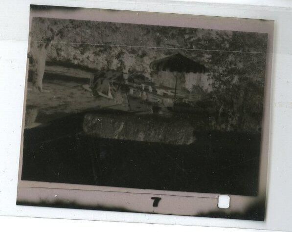 Negative. 1 1/2 x 1 1/4 b&w. Outdoor scene with benches, patio furniture. Unknown location, unknown date. Might be the circular patio in backyard of Schmidt House.