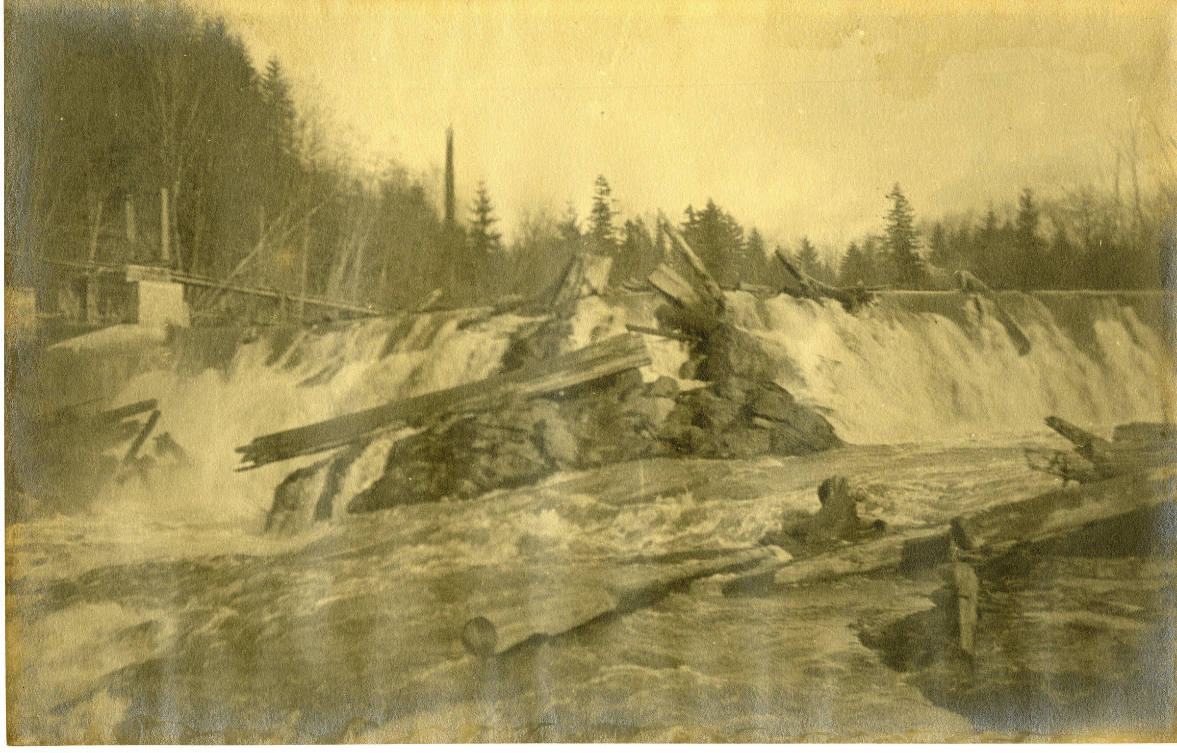 Print, photographic. 10 1/2 x 6 3/4 sepia. View of upper falls of Deschutes River at Tumwater.