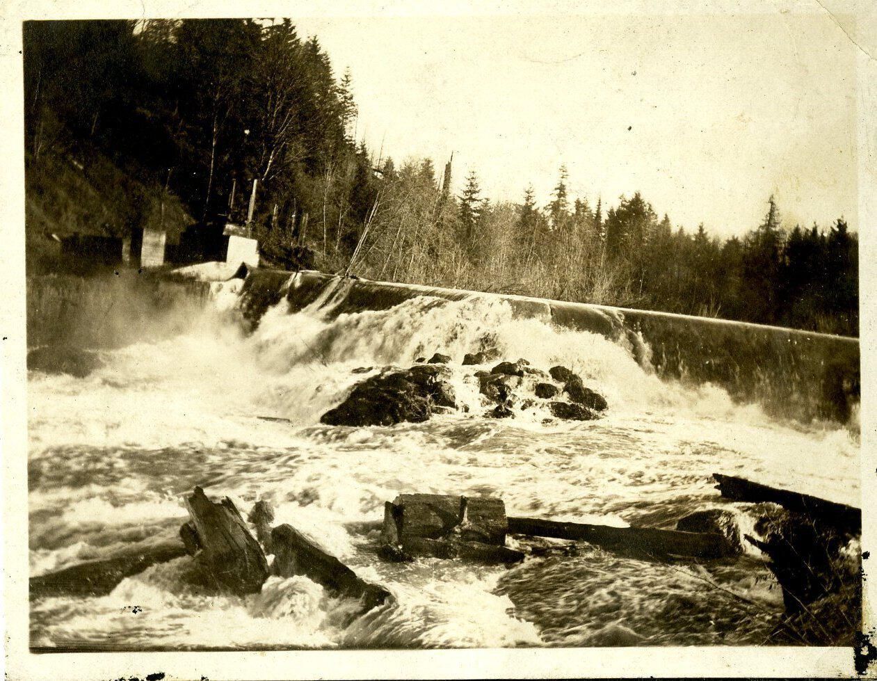 Print, photographic. 3 1/2 x 4 1/2, sepia. View of Deschutes River at Tumwater, upper falls.