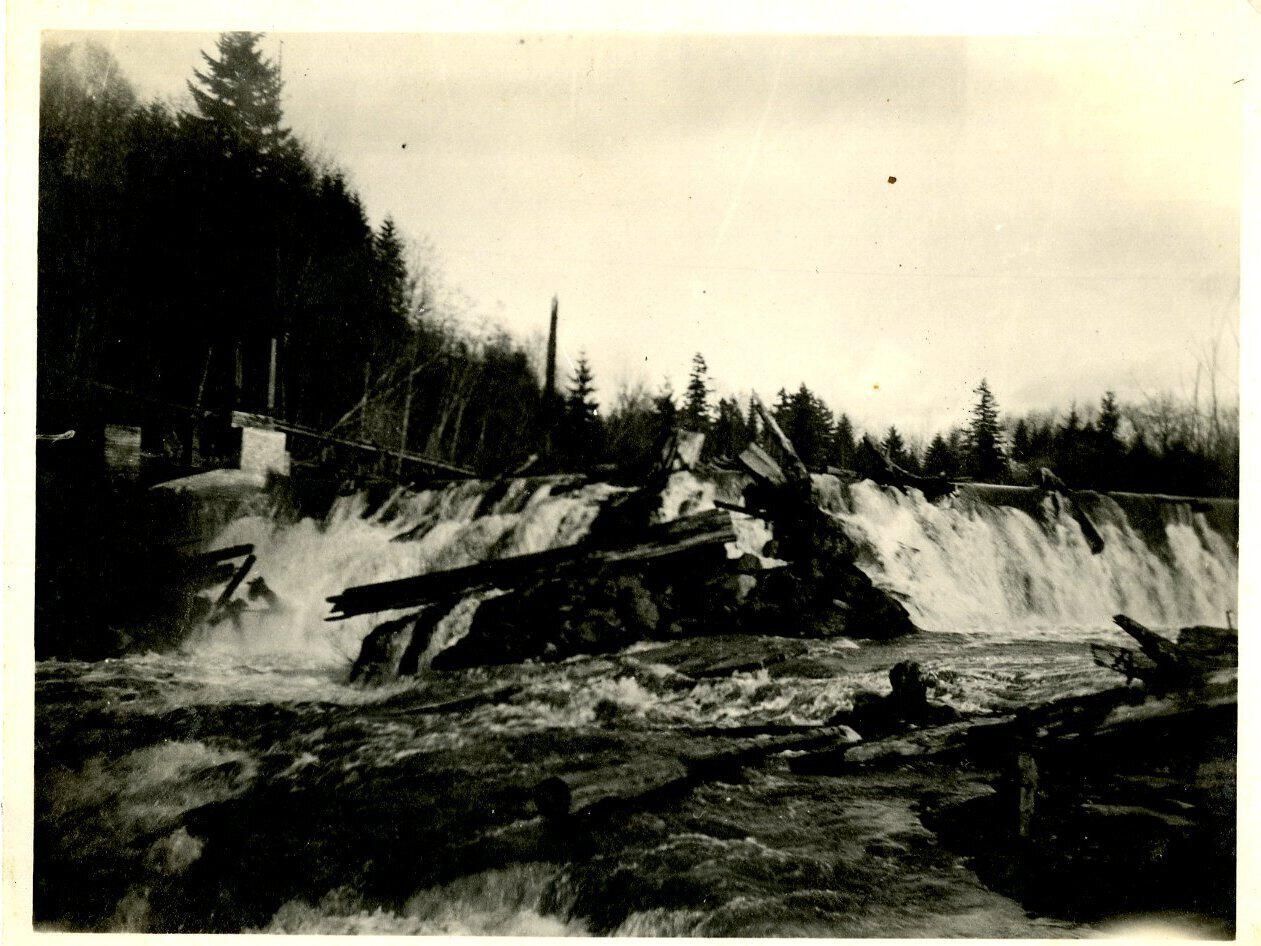 Print, photographic. 3 1/2 x 4 1/2, b&w. View of upper falls of Deschutes River, in Tumwater.