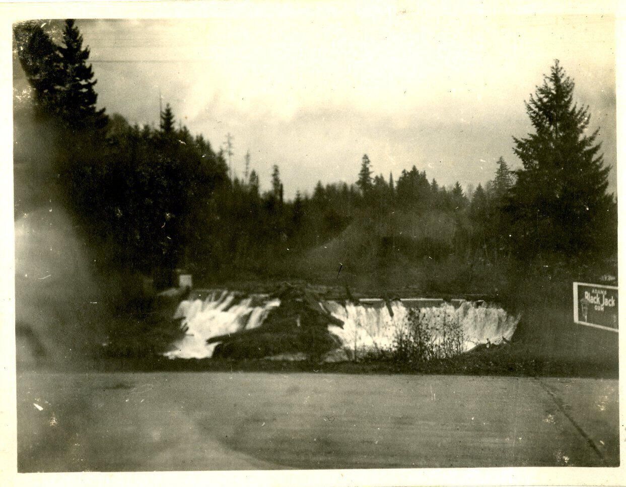 Print, photographic. 3 1/4 x 4 1/4, b&w. View of upper falls of Deschutes River, in Tumwater. Taken from street overlooking upper falls. On far right is a billboard advertising Adams Black Jack gum.Name/Title