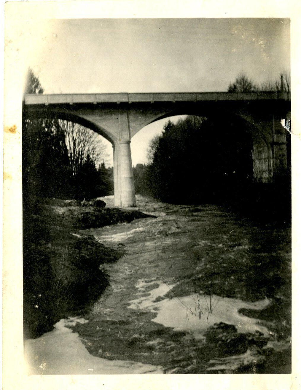 Print, photographic. 3 1/2 x 4 1/2, b&w. View of Deschutes River, in Tumwater. Looking downstream from upper falls, with Boston Street bridge in middle ground.