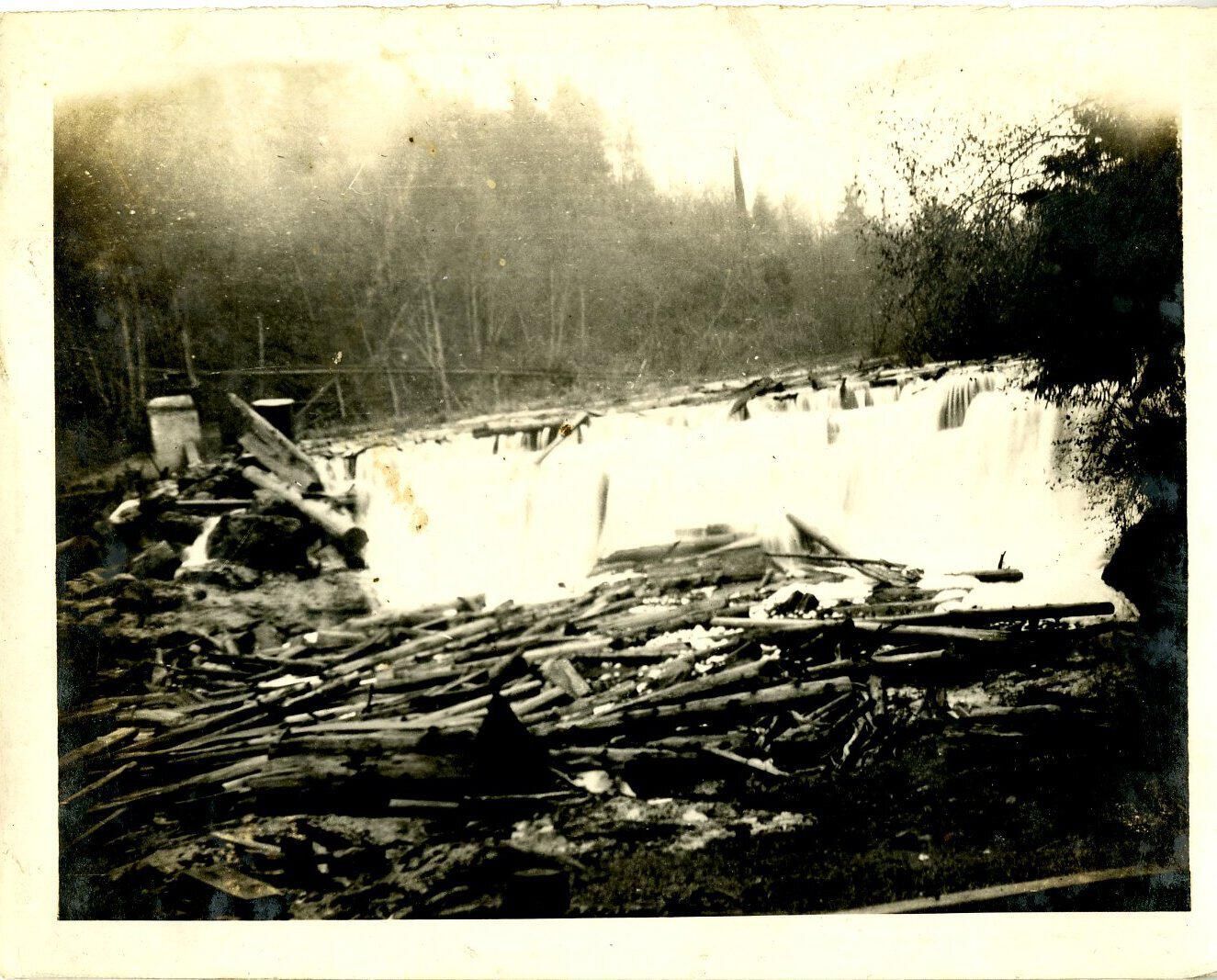 Print, photographic. 3 1/2 x 4 1/2, b&w. View of upper falls of Deschutes River, in Tumwater. Looking upstream, with masses of driftwood in foreground.