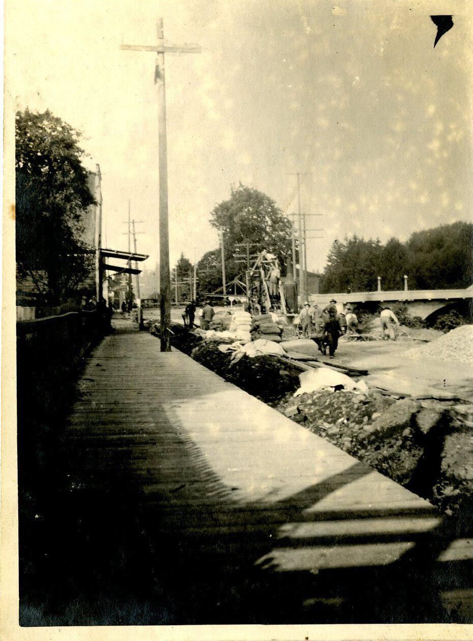 Print, photographic. 3 1/2 x 4 1/2, b&w. View of Tumwater. View looking northeast from street above upper falls, showing new boardwalk and streetwork in process. Some buildings down boardwalk on left side. Boston Street bridge in background.Name/Title