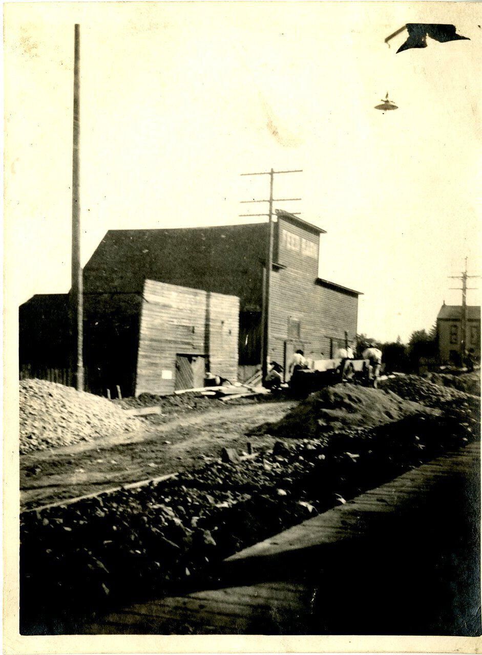 Print, photographic. 3 1/2 x 4 1/2, b&w. View of Tumwater. View looking southeast from street above upper falls, showing new boardwalk and streetwork in process. Some buildings across street; one marked Feed Barn.Name/Title
