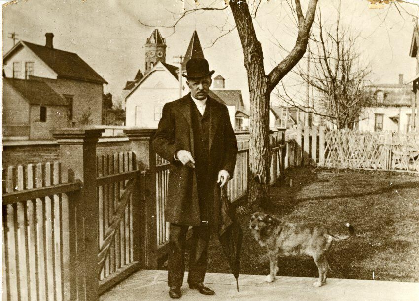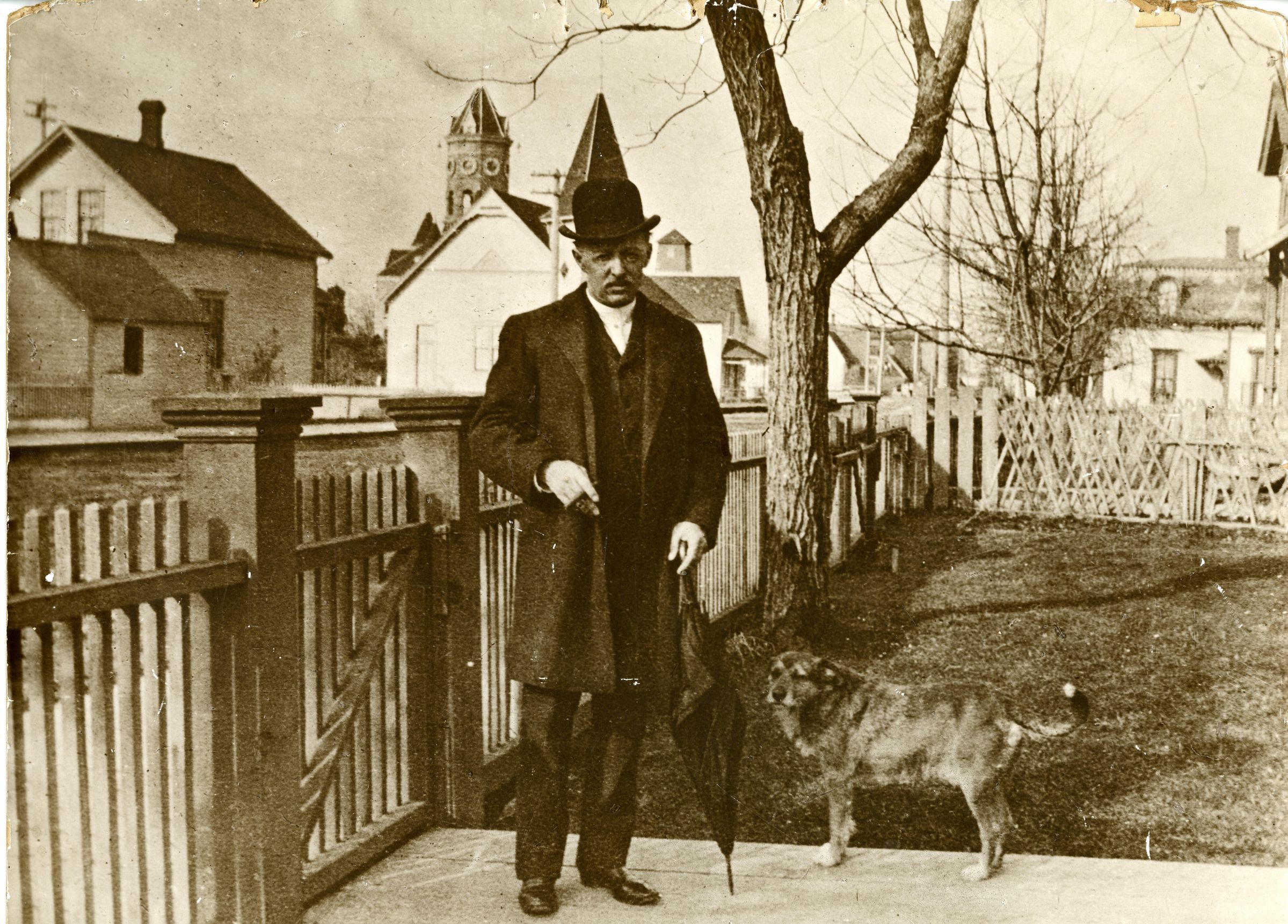 Photograph. 17 x 13 1/2, sepia mounted on cardboard. Photo of Emil Wolf, first bookkeeper at Olympia Brewing Company. Image shows elderly man and dog standing on sidewalk with houses and Thurston County Courthouse in background. On back of photo: "Emil Wolf, born in Odessa, Russia, died 1908, first bookkeeeper." Also on back is a blue adhesive dot marked "G-22" which is an old OTF collection number. At some point in the past, this photograph belonged to the OTF collection and was then removed by persons unknown. In the "Historical Materials at Three Meter" index, this photo is described as:"Emil Wolf, first bookkeeper. Taken in downtown Olympia."Name/Title