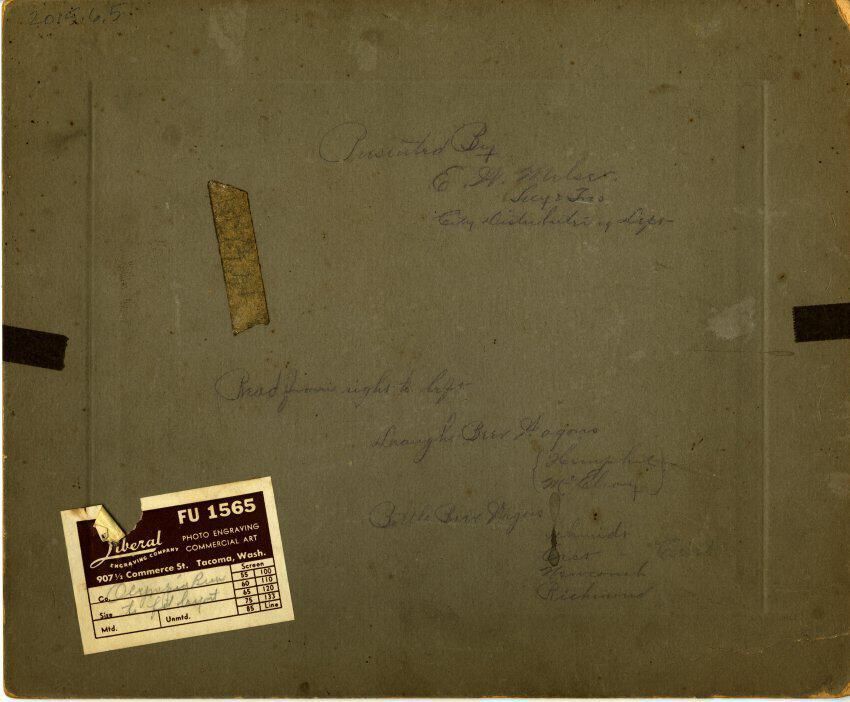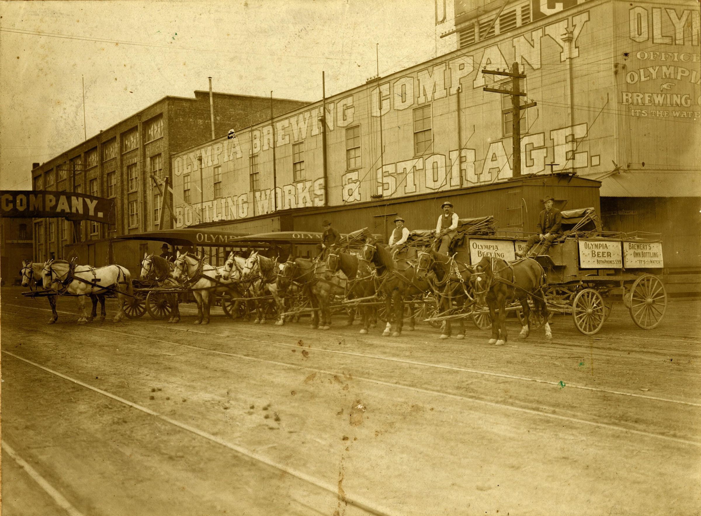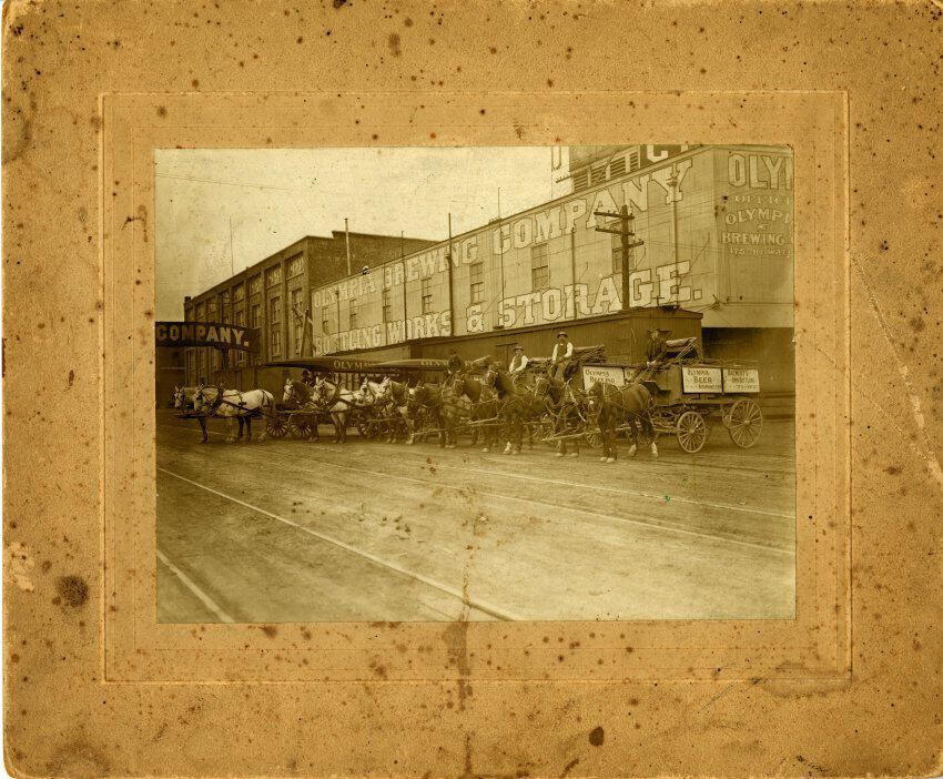 Photograph. Image 8 x 6, on 12 x 10 cardboard. Photo of Olympia Brewing Company Bottling Works & Storage in Seattle. Six horse-drawn delivery wagons in front of bottling plant. Written in pencil on back: "Presented by E. W. Miles Secy & Tres City Distributing Dept" and "Read from right to left: Draught beer wagons, Hemphil, McElroy; Bottle Beer wagons, Schmidt, Erst [?], Newcomb, Richmond." Names identify drivers of beer wagons in photo. Also on back is paper tag from Liberal Engraving Company, Tacoma.