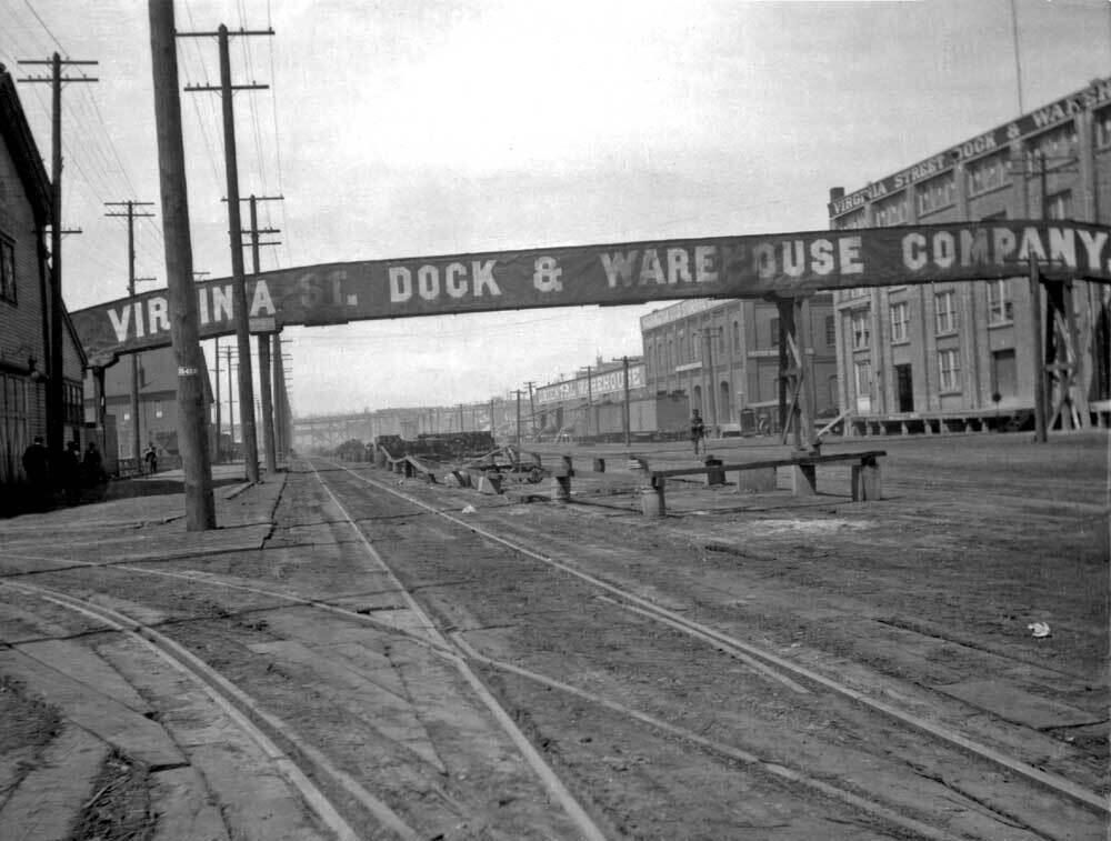 Location was corner of Railroad Avenue and Stewart Street, which is at wharf level below present-day Pike Place Market. Sign on far left extended over several railroad tracks and read in full: "Virginia St. Dock & Warehouse Company." See attached image circa 1911 from Paul Dorpat, Seattle Times columnist/historian.Name/Title