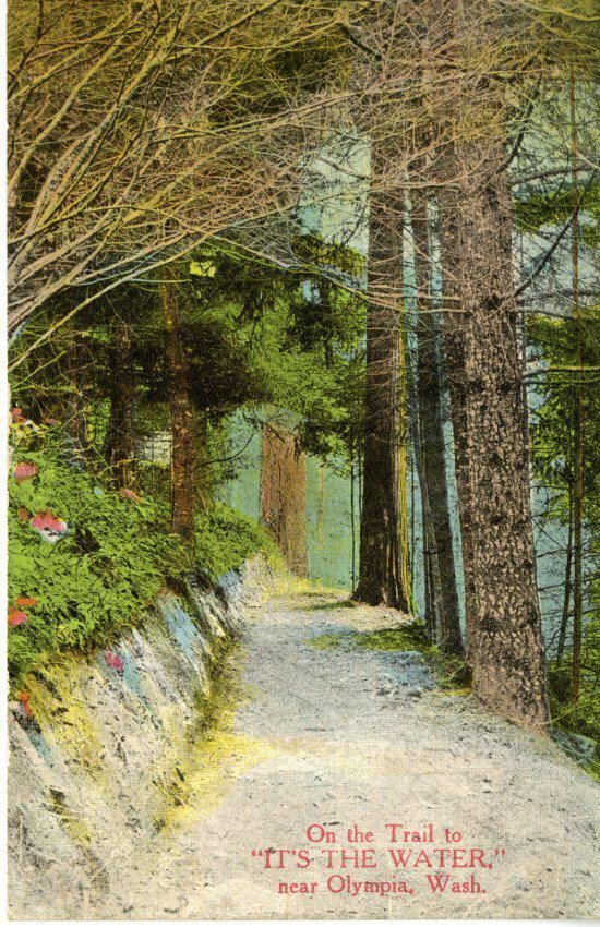 Postcard, picture (2). 3 1/2 x 5 1/2. Color photo of trail and tall trees. Captioned "On the Trail to "IT'S THE WATER" near Olympia, Wash." Divided back.