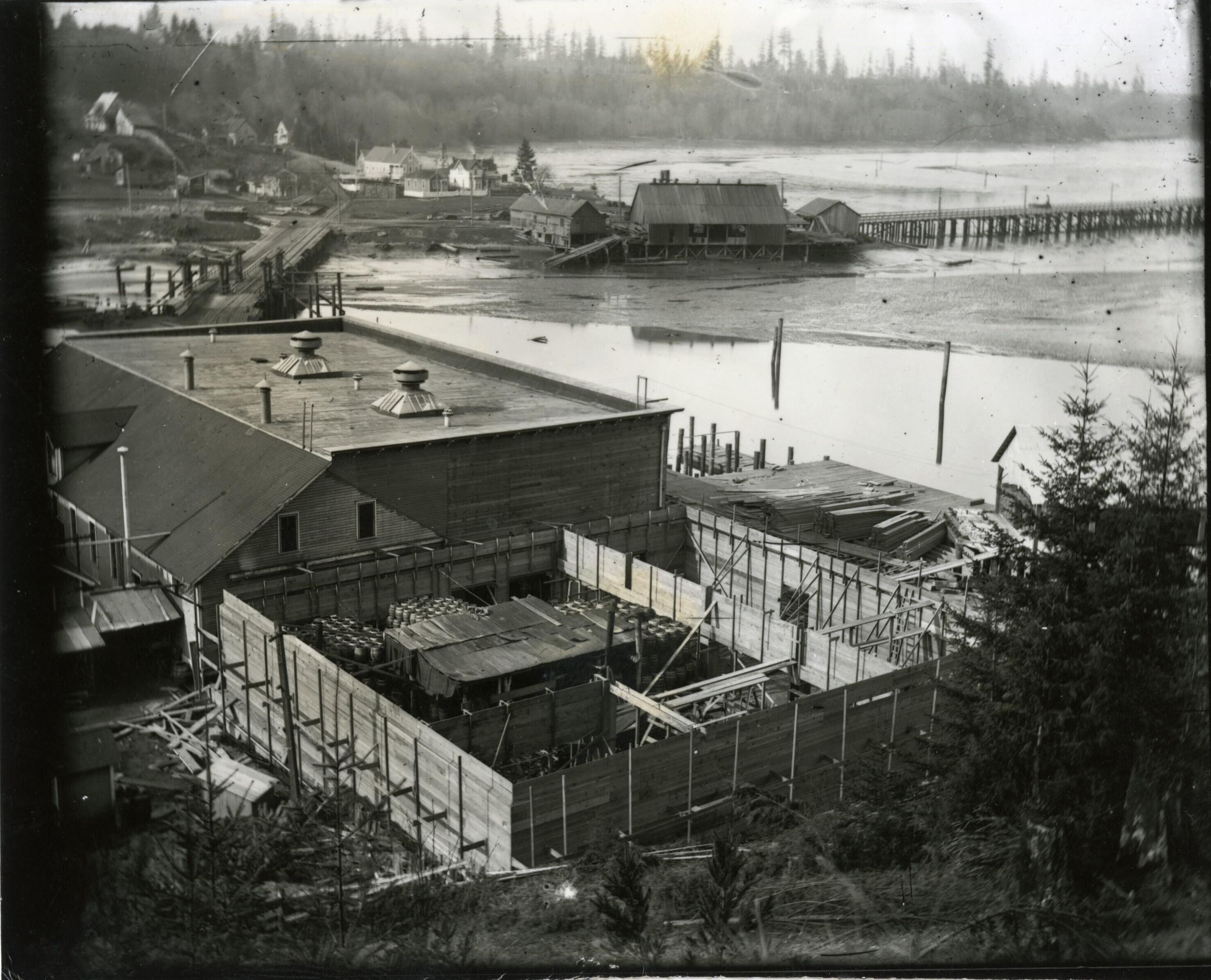 Photograph. 5 x 4 b&w. Photo of the back of the Olympia Brewing Company brewery, taken from the southeast. Shows brewery buildings in foreground, and long bridge to Olympia in the background. Fairly modern reprint of an old photo.Name/Title