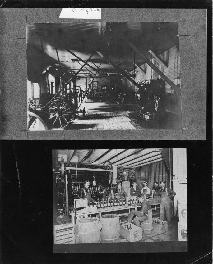 2. Lower image 5 x 3 1/2 b&w. Shows 6 men standing and 1 man sitting around bottle line at original Olympia Brewing Company plant.Name/Title