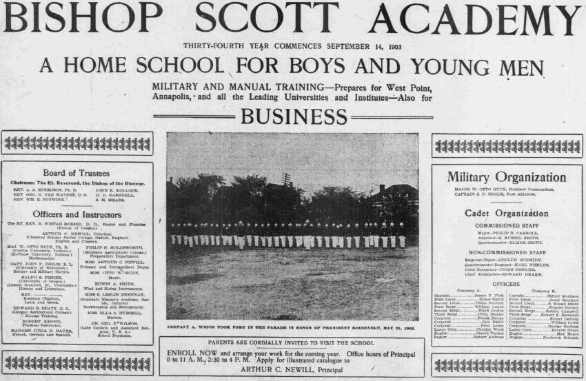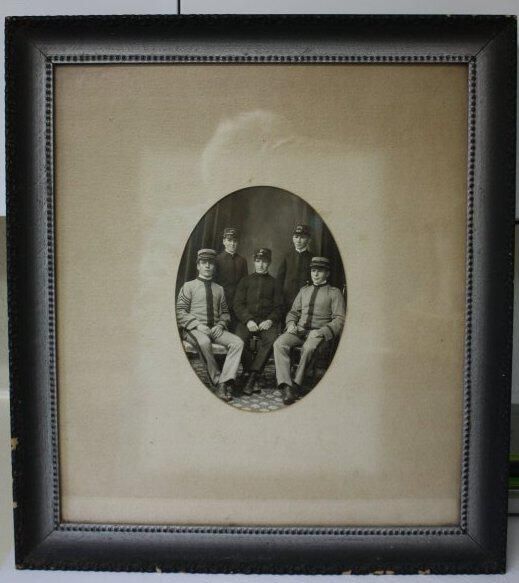 Photograph. Image 5 1/2 x 7, in 16 x 18 wood frame with glass. Photo of Leopold and Johanna Schmidt's five sons: Peter, Adolph, Frank, Leopold Jr., and Fredrick, all dressed in what appear to be uniforms from a military school. Probably taken while the younger boys were attending Bishop Scott Academy in Portland.