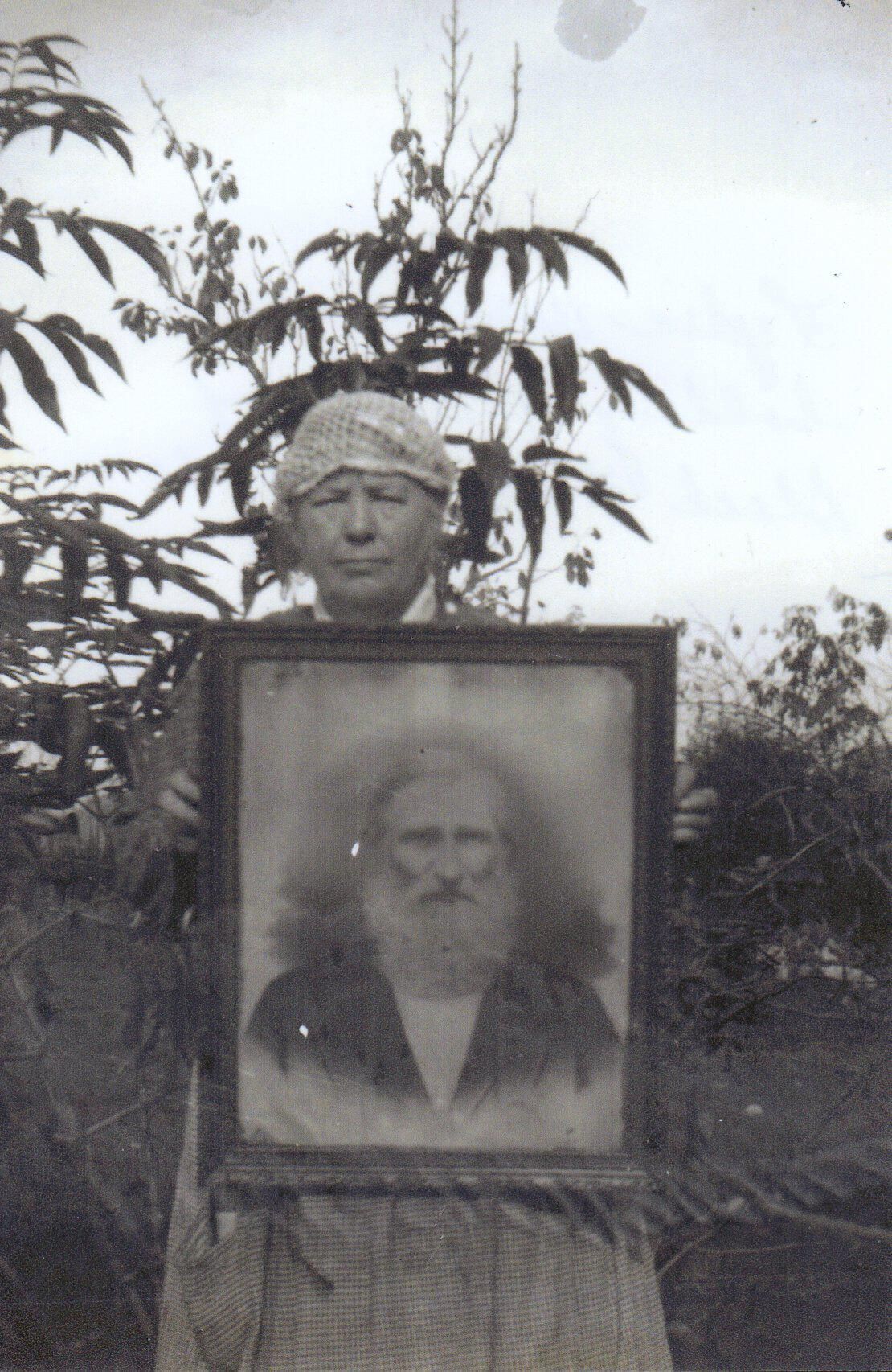 Print, photographic. Modern reproduction of 4 x 6 sepia photo. Shows Lydia Weatherman holding a portrait of William O. Thompson. Photo accompanies a Bible (2015.3.4), which was given by William O. Thompson to Lydia Weatherman, who passed the Bible on to Helen Van Mechelen. Helen's husband Dan gave the Bible to Tumwater Historical Association in 2015.Name/Title