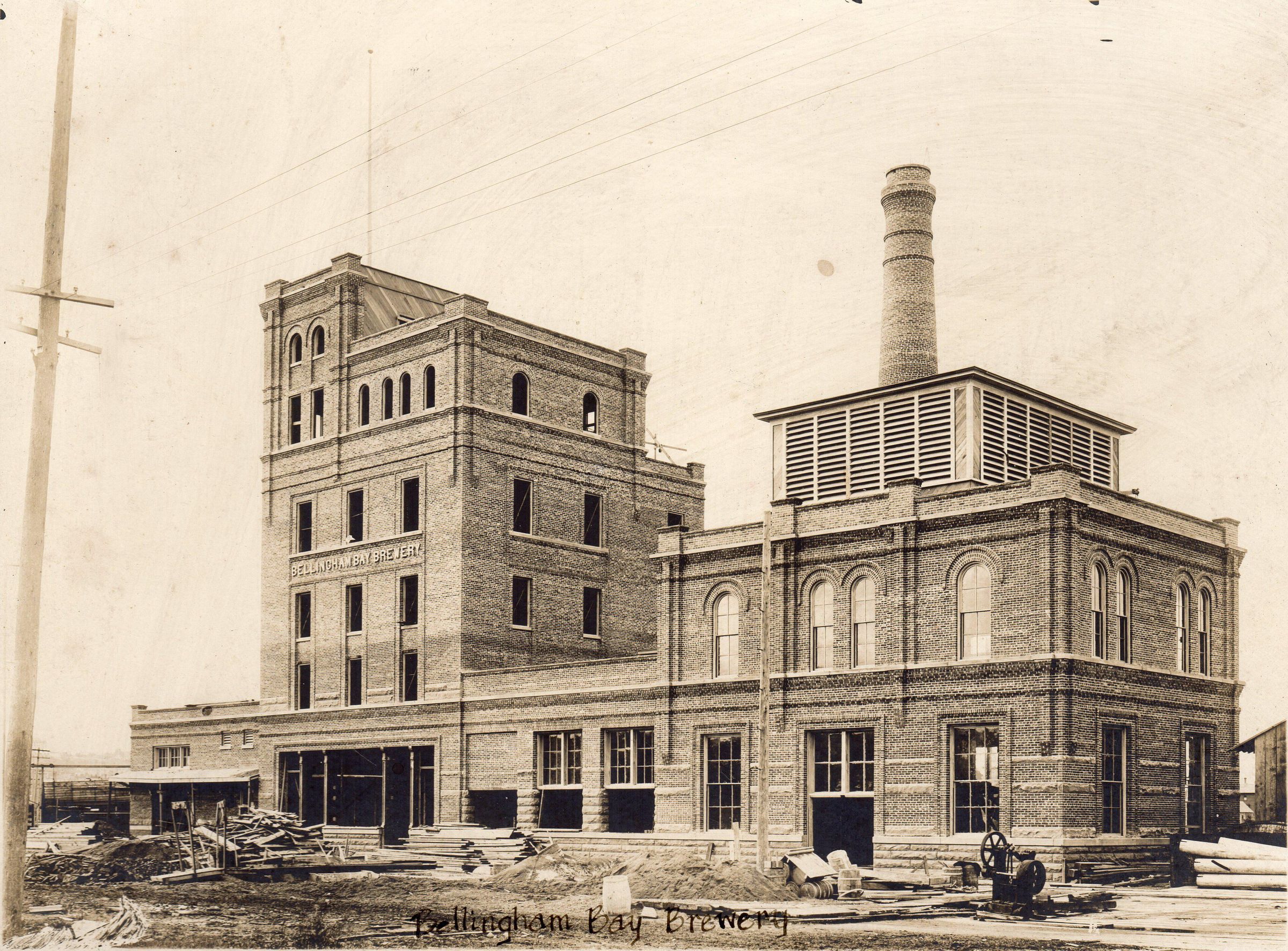 Print, photographic. 8 1/2 x 6 1/4 b&w mounted on 12 x 10 gray board. Image of Bellingham Bay Brewery building under construction.