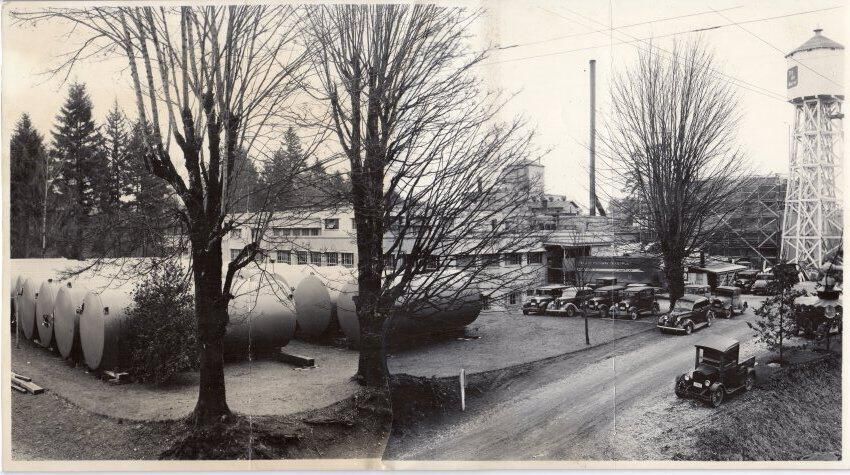 Print, photographic. 13 1/2 x 7 3/4 b&w mounted on board. Image of Olympia Brewing Company plant. Shows tanks in front, cars to right, water tower on far right. Water tower was removed prior to 1938.Name/Title