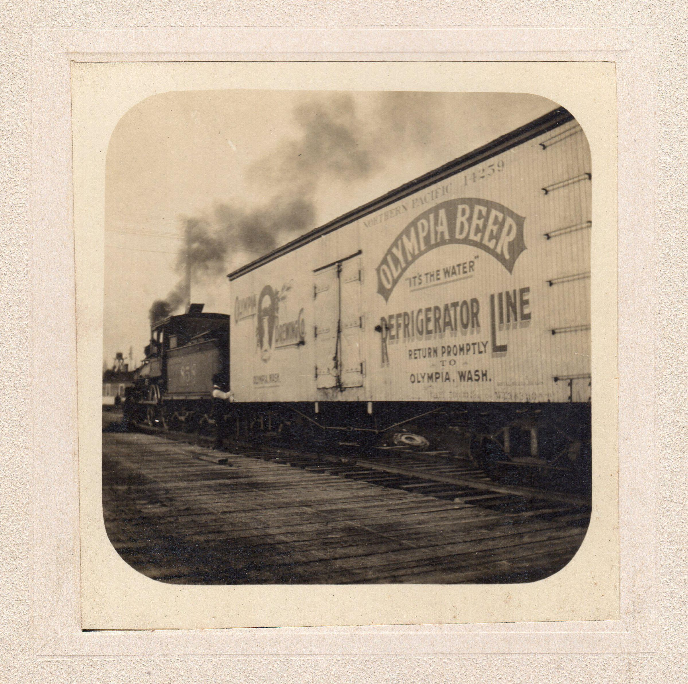 Print, photographic. 3 x 3 b&w mounted on 5 x 5 tan board. Image of railroad engine and coal car, pulling boxcar with Olympia Beer Refrigerator Line painted on side, with Olympia Brewing Company logo.Name/Title