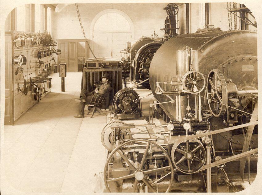 Print, photographic. 8 x 6 sepia mounted on 10 x 8 brown board. Image of interior of Olympia Light and Power powerhouse #2 at Lower Falls, Deschutes River. Shows one man sitting in chair amid engines and control panel.Name/Title