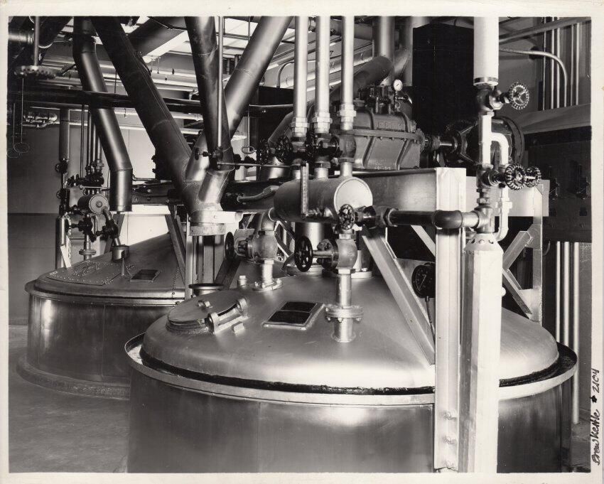 Print, photographic. 9 x 7 b&w mounted on board. Image of interior of Olympia Brewing Company plant, showing mash tub and cooker.