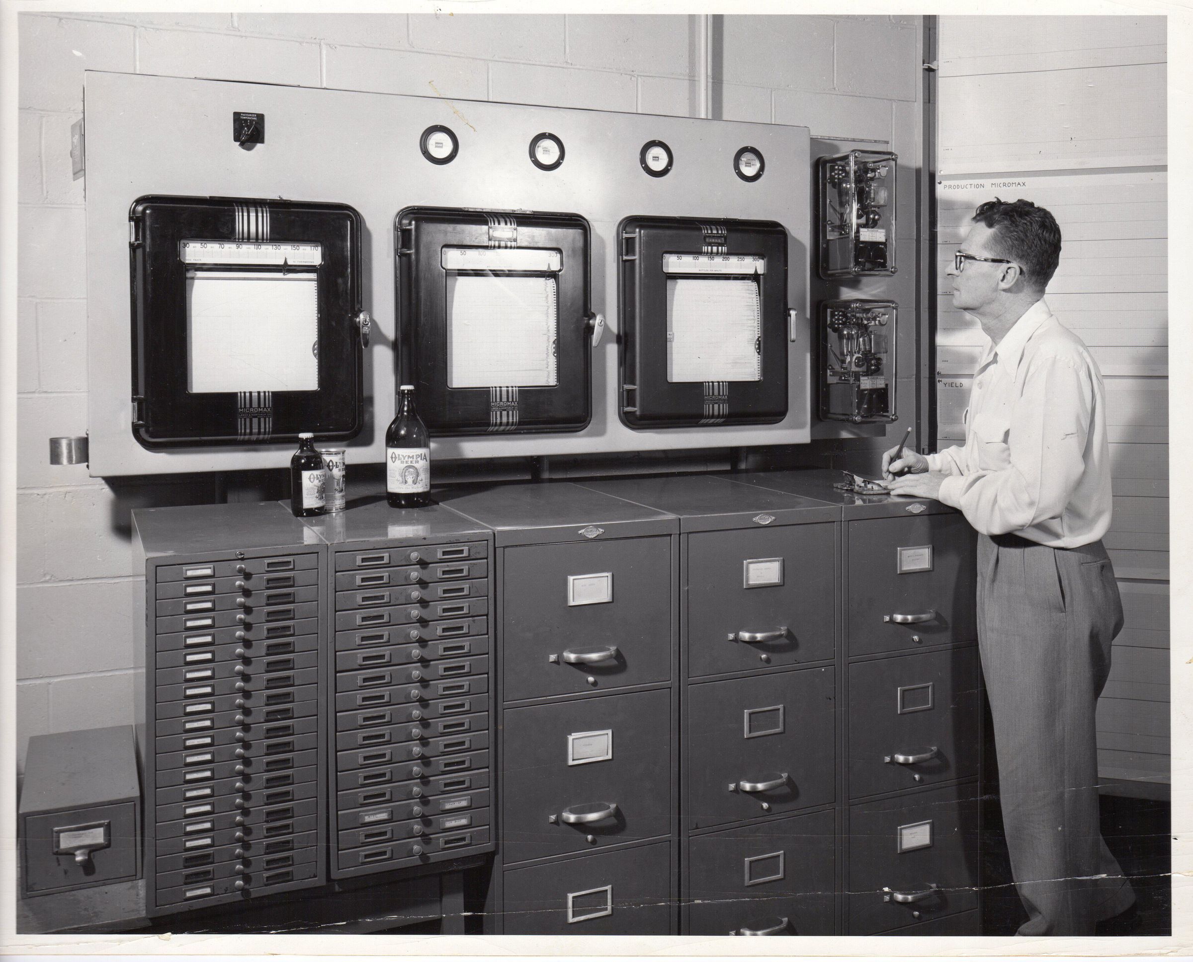 Print, photographic. 10 x 8 b&w mounted on board. Image of unidentified man standing in front of control panel for pasteurizers; located in bottlehouse supervisor's office at the Olympia Brewing Company, Tumwater.Name/Title