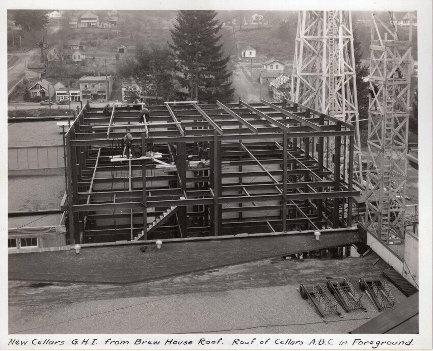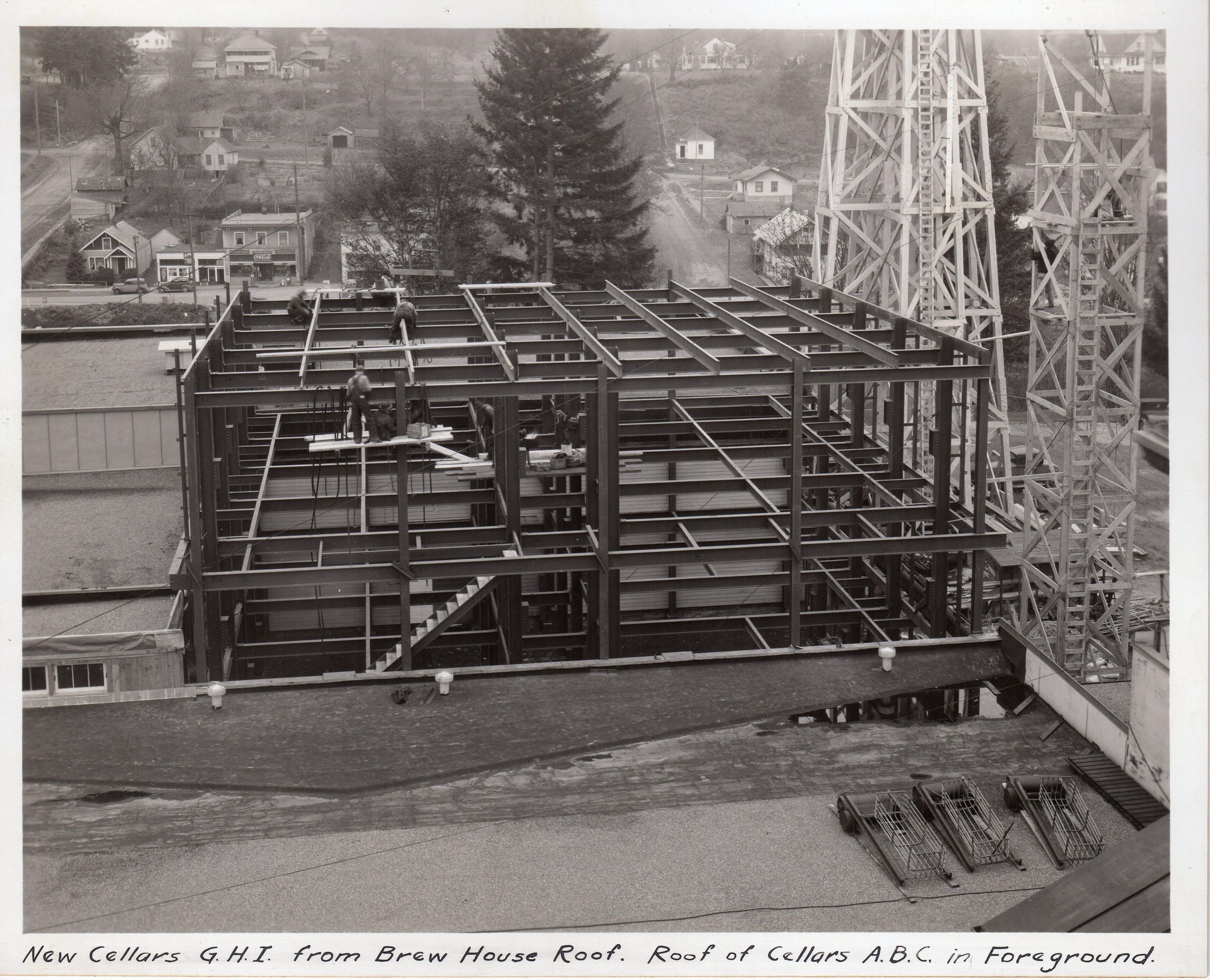 Print, photographic. 9 1/2 x 7 3/4 b&w mounted on board. Image of Olympia Brewing Company, new cellars GHI under construction. Photo taken from brewhouse roof. Roof of cellars ABC in foreground. Shows downtown Tumwater businesses (drug store) in background across river.Name/Title