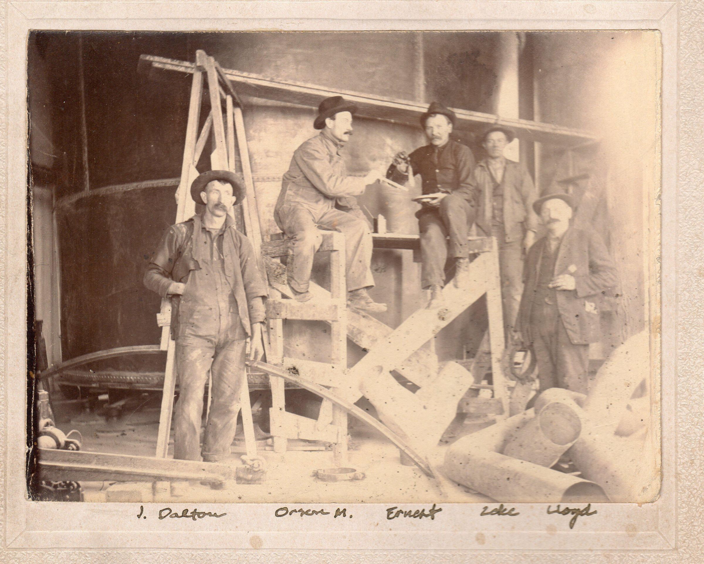 Print, photographic. 5 x 3 1/2 sepia on 6 x 5 1/2 tan board. Image of 5 men (J. Dalton, Orgem? M., Ernest, Zeke, Lloyd) working on a construction project, probably at the old Olympia Brewing Company plant or at the gas plant.Name/Title