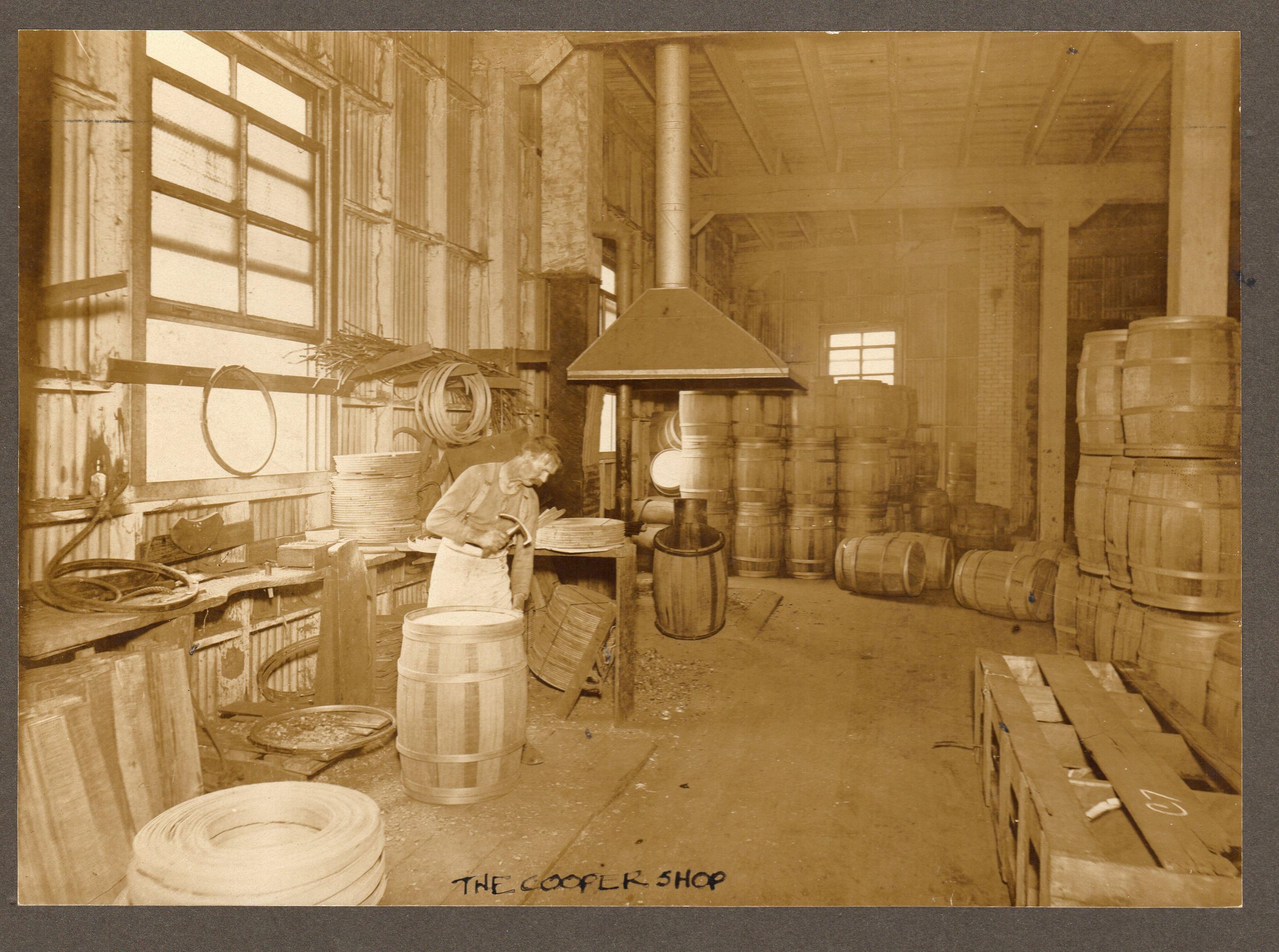Print, photographic. 8 x 5 1/2 sepia on 11 x 9 brown board. Image of unidentified man making a wooden barrel in the cooper shop of old Olympia Brewing Company plant. Barrels were stuffed with excelsior or other padding material and used to ship beer bottles.Name/Title