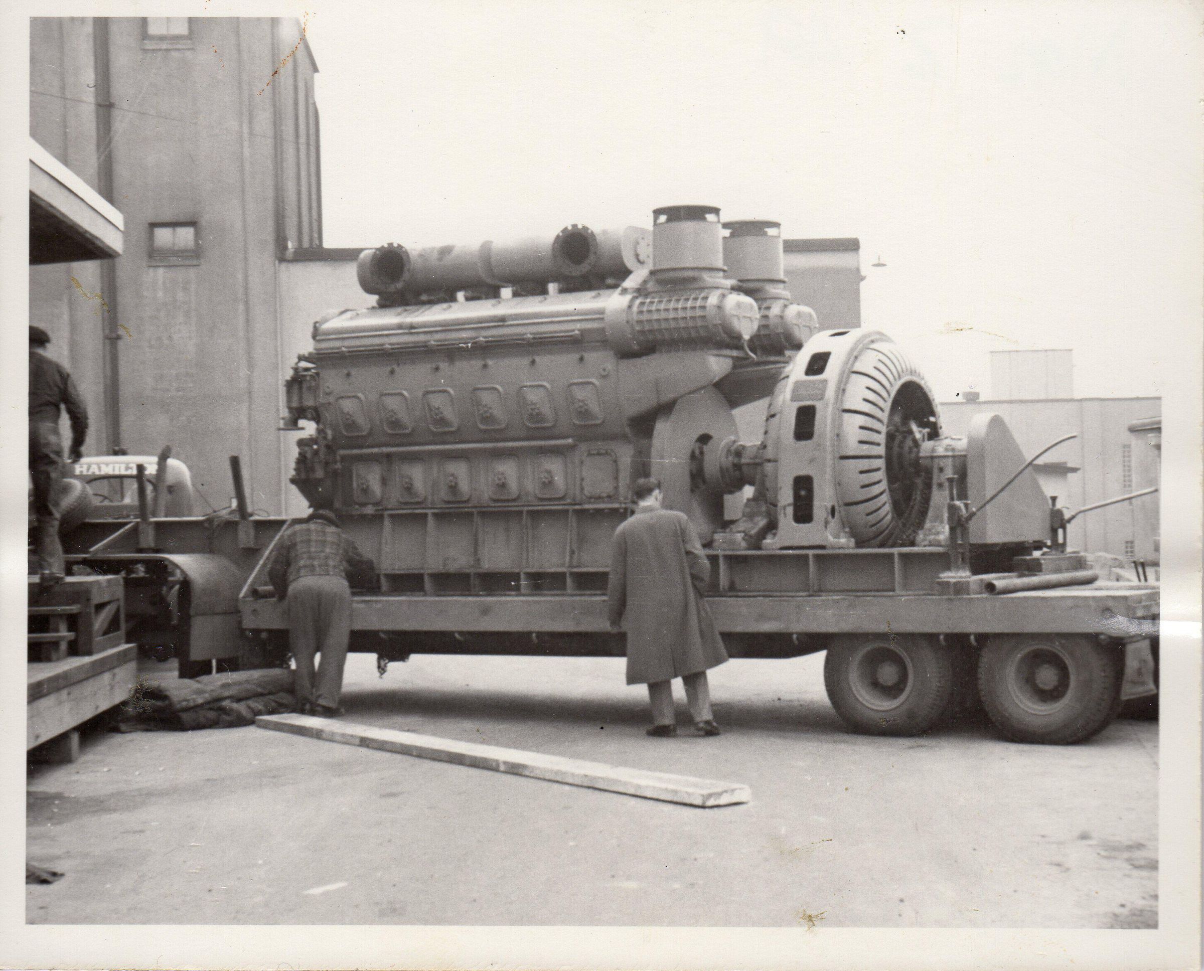 Print, photographic. 4 1/2 x 3 3/4 b&w mounted on board. Image of unidentified men unloading truck carrying an auxilliary power generator, at the Olympia Brewing Company. Brewery had 2 generators like this.Name/Title