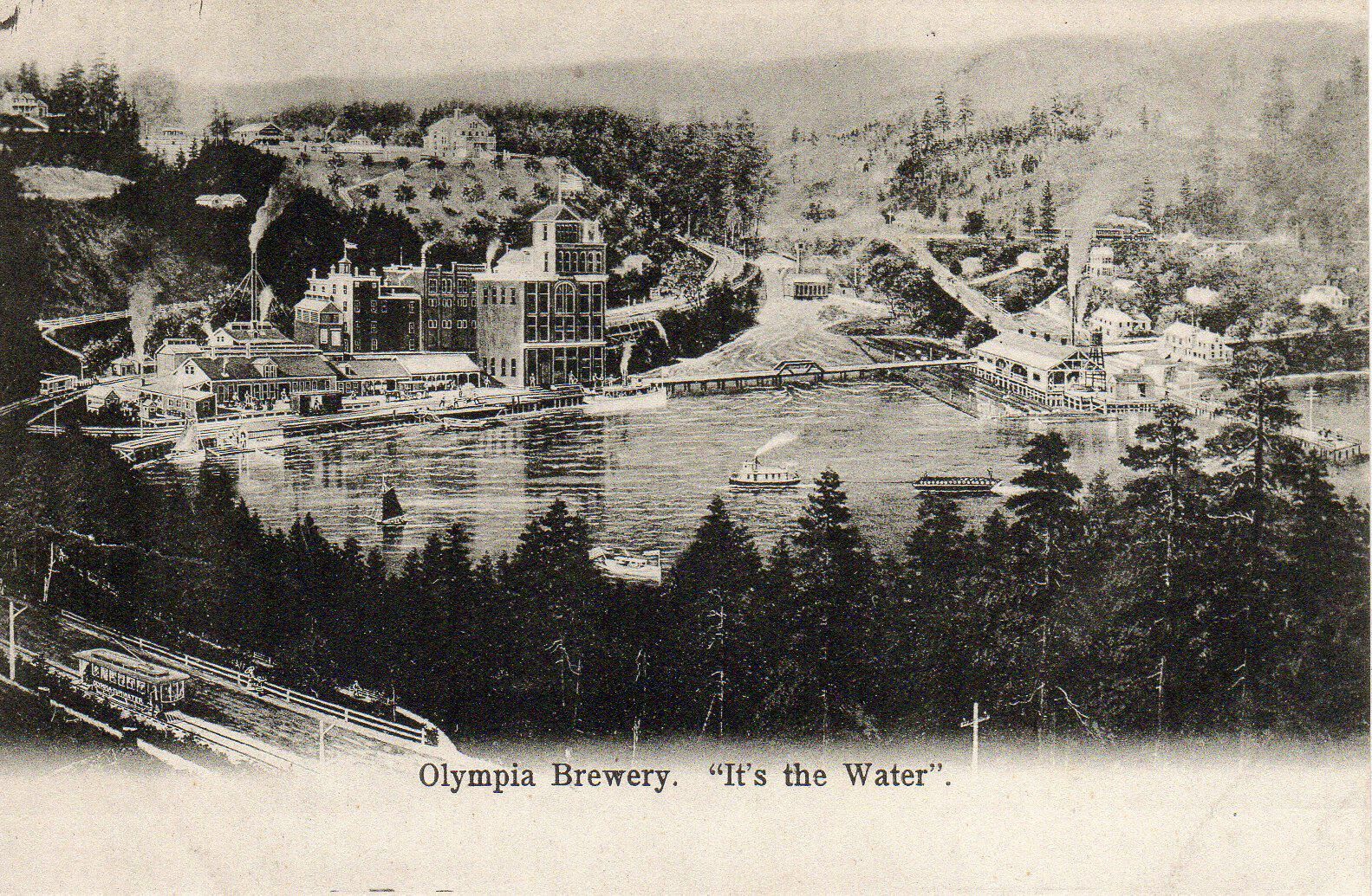 Postcard, picture. 5 1/4 x 3 1/2 b&w. View of Olympia Brewing Company from Olympia hill, looking southwest. Artwork by Edward Lange. Postcard published by Winstanley & Blankenship, Olympia.