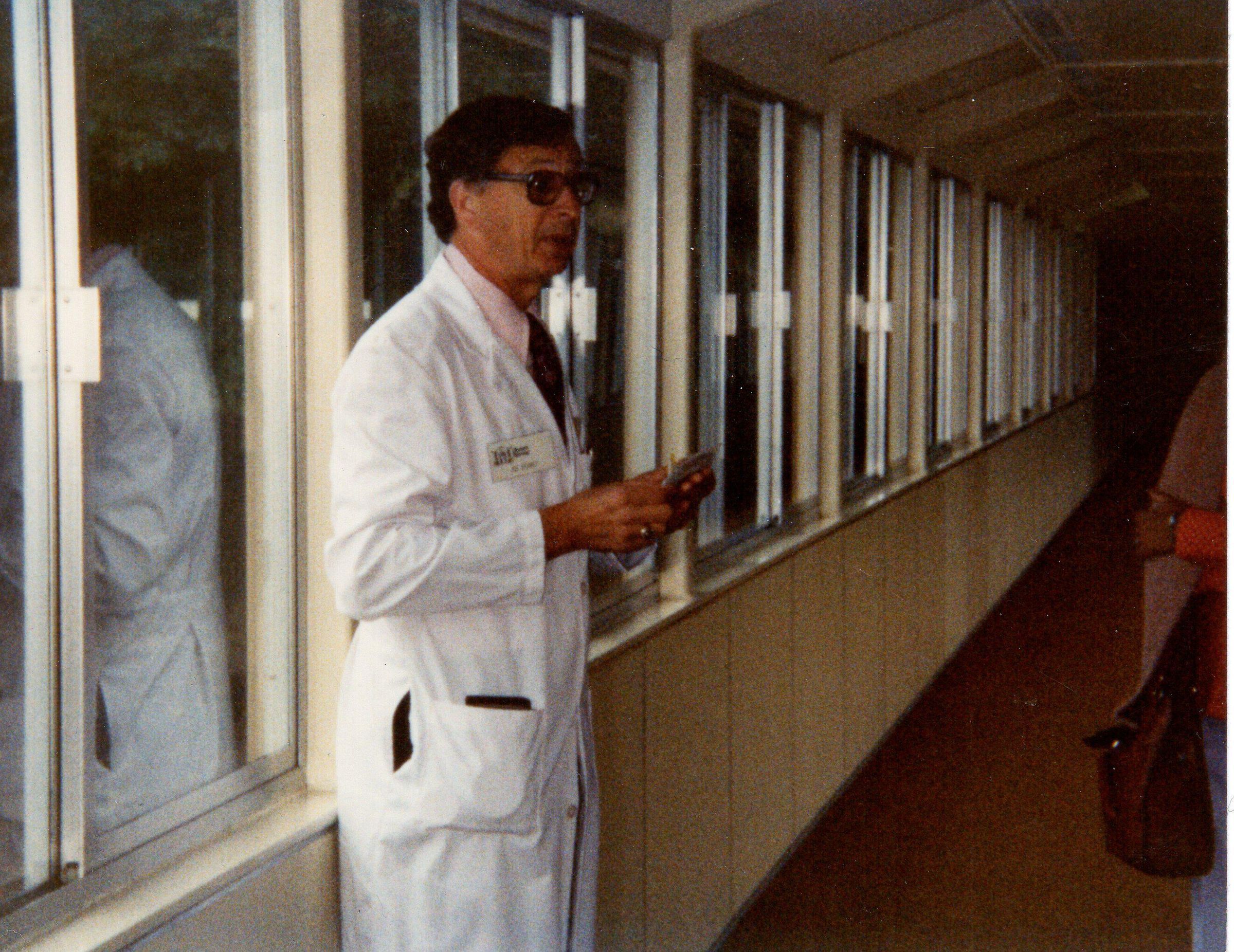 Print, photographic. 4 1/2 x 3 1/2 color photo. Unidentified man (same as 2007.1.41) in white coat standing in front of a bank of windows. Probably a tour guide at the Olympia Brewing Company.